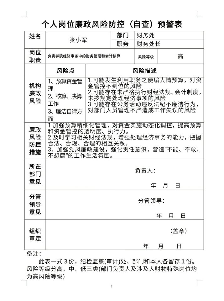 张小军2020个人岗位廉政风险防控(自查)预警表