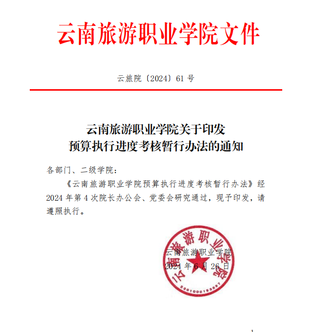 云旅院〔2024〕61号bevictor伟德国际1946官网关于印发预算执行进度考核暂行办法的通知