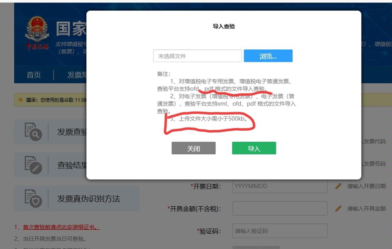 1、把全电发票扫描为PDF ,大小控制在500kb以内,选择导入方式导入验证。