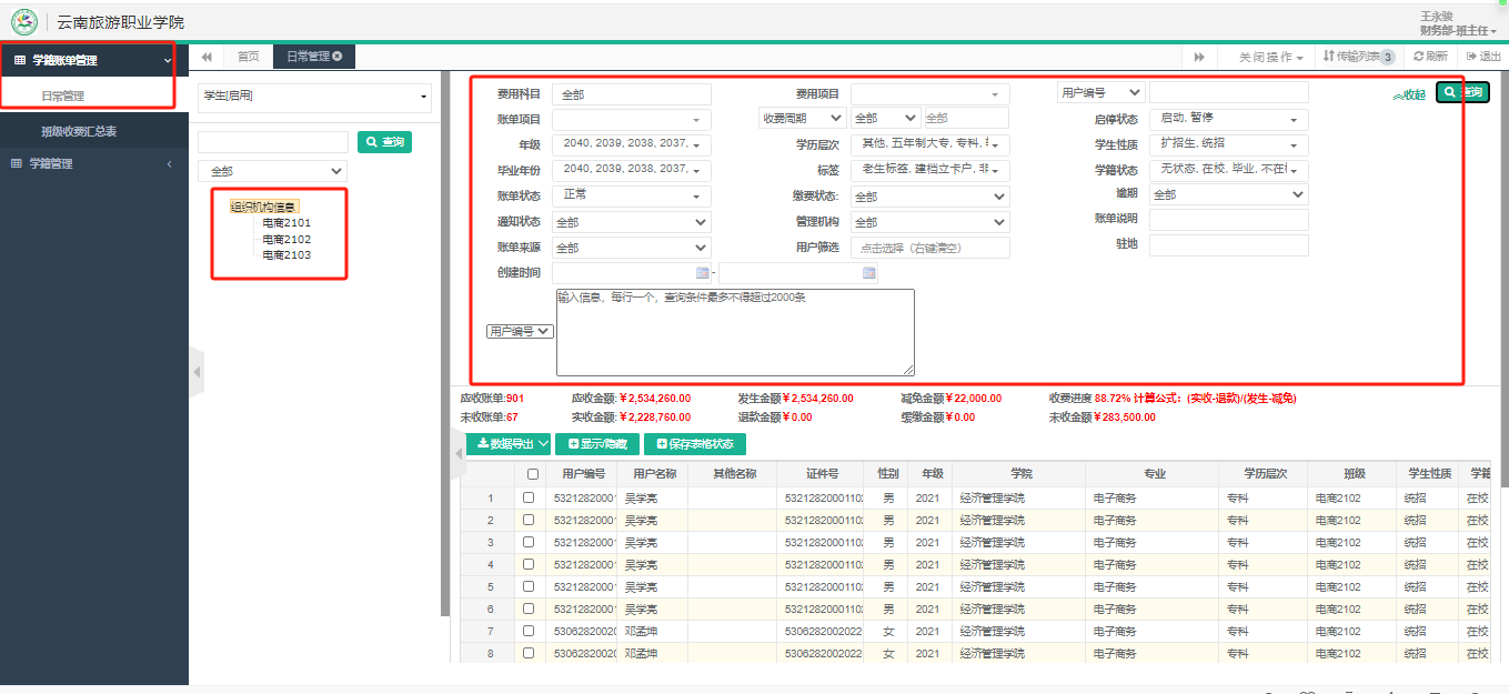 可按年级、专业、班级等维度进行筛选,也可输入姓名或者身份证号码进行精确查询。系统可导出欠费学生明细清单,便于学院开展后续工作。