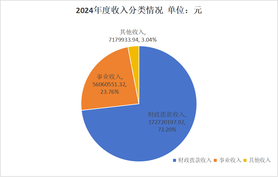 bevictor伟德国际1946官网2024年度收入合计235960683.18元。其中:财政拨款收入172720197.92元,占总收入的73.20%;无上级补助收入;事业收入56060551.32元(含教育收费56060551.32元),占总收入的23.76%;无经营收入;无附属单位上缴收入;其他收入7179933.94元,占总收入的3.04%。
