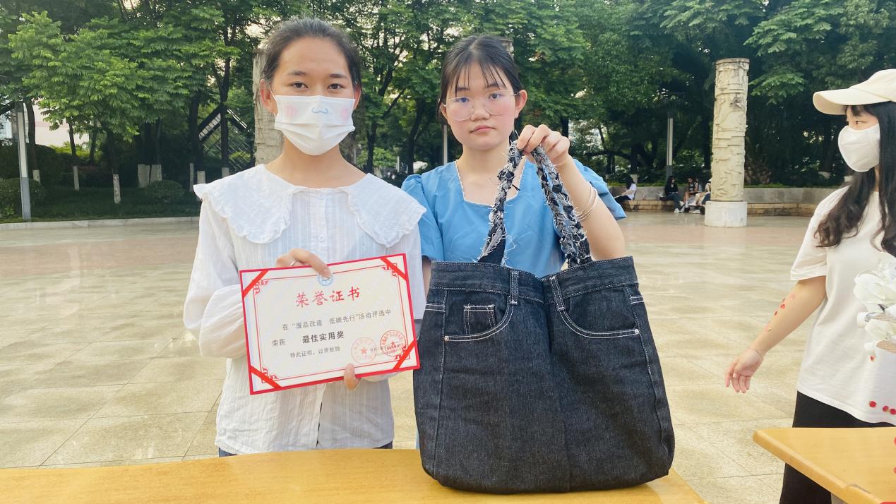 比赛当天,由改造小组成员介绍了作品的制作过程和设计理念,并进行作品展示,有利用纸箱制作的拖鞋;有利用废弃电动牙刷做的蜻蜓桌面清扫机;有利用废旧水瓶所做的莲花灯;有利用废旧牛仔裤做的单肩包......