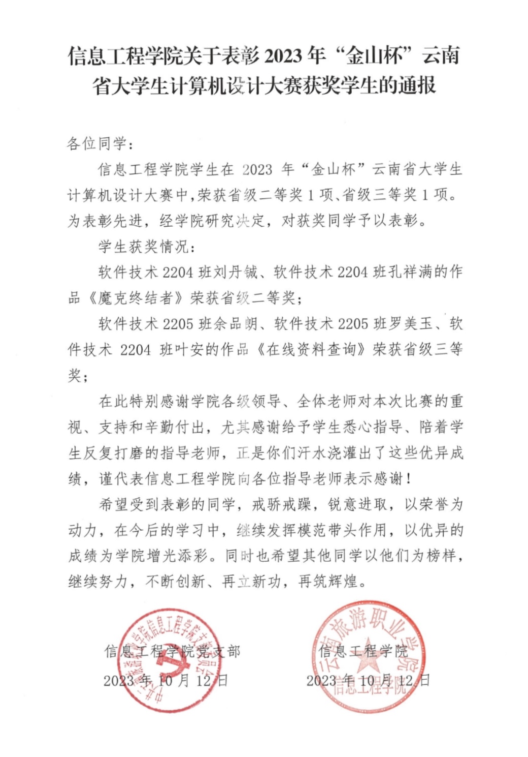 信息工程学院关于表彰2023年“金山杯”云南省大学生计算机设计大赛获奖学生的通报