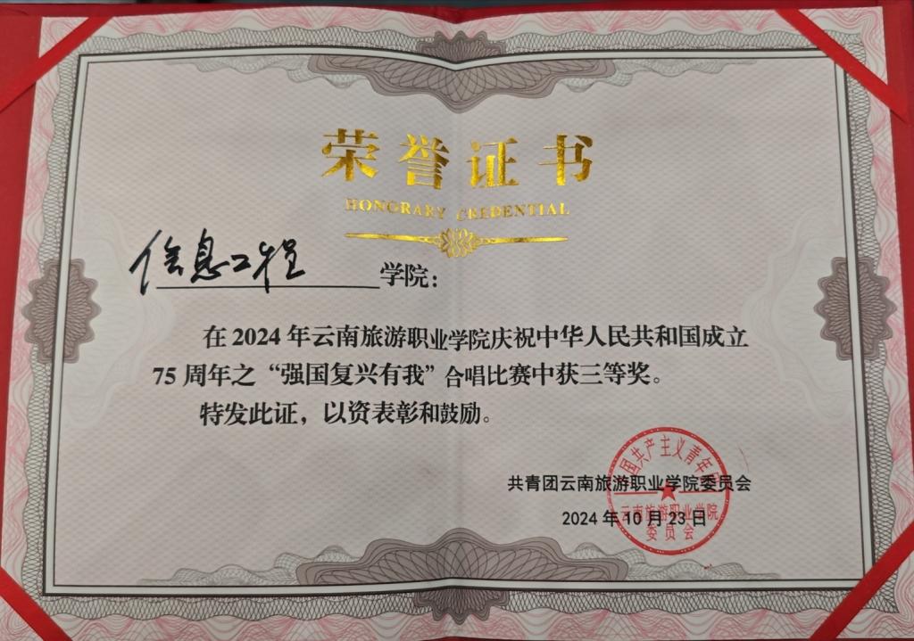 经过激烈的角逐,信息工程学院在本次合唱比赛中获得三等奖。这份荣誉,是对同学们努力的肯定,也是他们对祖国深情的见证。