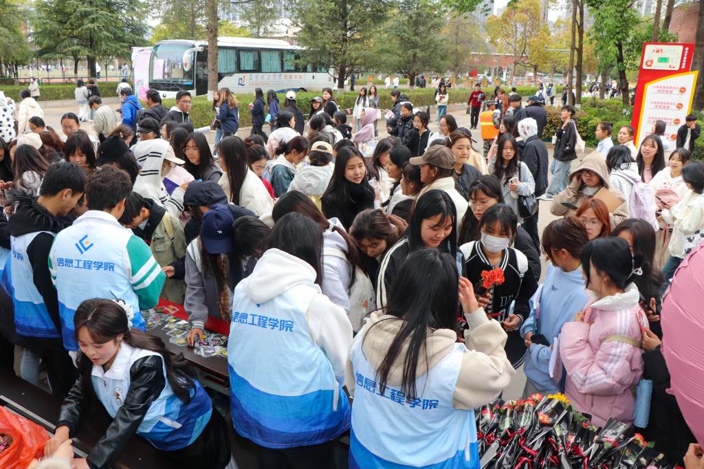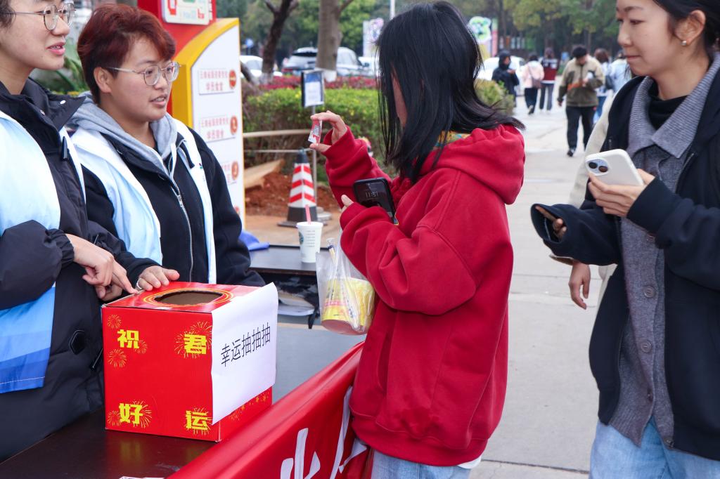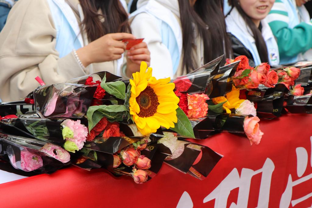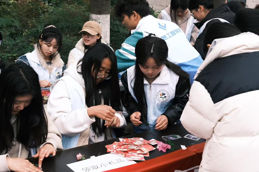 全院师生积极参与,活动现场熙熙攘攘,热闹非凡。粉色大气球搭配烂漫花束,营造出温馨又浪漫的节日氛围。每位参与者都有一次抽签机会,抽签箱内装满了写有奖品名称的纸条,奖品琳琅满目,既有芬芳四溢的鲜花、设计精巧的书签、满载心意的贺卡,还有难得一遇的现场亲手制作书签的机会。现场洋溢着欢声笑语,气氛热烈而温馨。