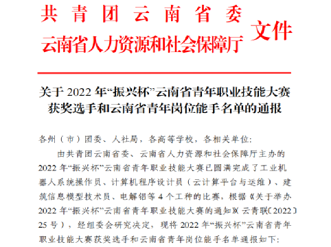 由共青团云南省委、云南省人力资源和社会保障厅主办的2022年“振兴杯”云南省青年职业技能大赛(职工组)有来自全省的各企业、院校的79名选手参赛。