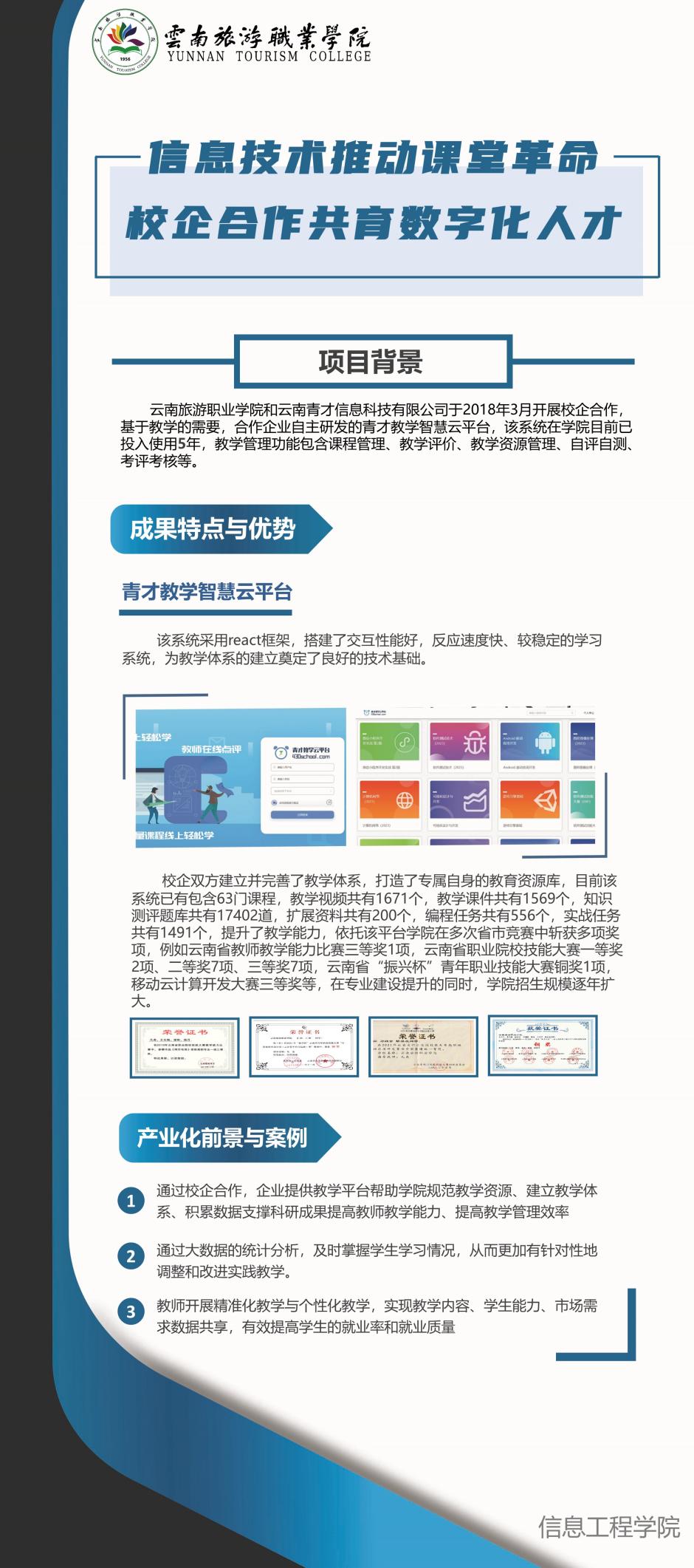学校与云南青才科技有限公司开展校企合作以来,基于教学需要以及新时代数字化进程的发展,合作企业自主研发的青才教学智慧云平台已投入使用5年,平台内开设63门课程。依托该平台学院在省市竞赛中斩获多个奖项,例如云南省教师教学能力比赛三等奖1项,云南省职业院校技能大赛一等奖2项、二等奖7项、三等奖7项,云南省“振兴杯”青年职业技能大赛铜奖1项,动云计算开发大赛三等奖等,在专业建设提升的同时,学院招生规模逐年扩大。
