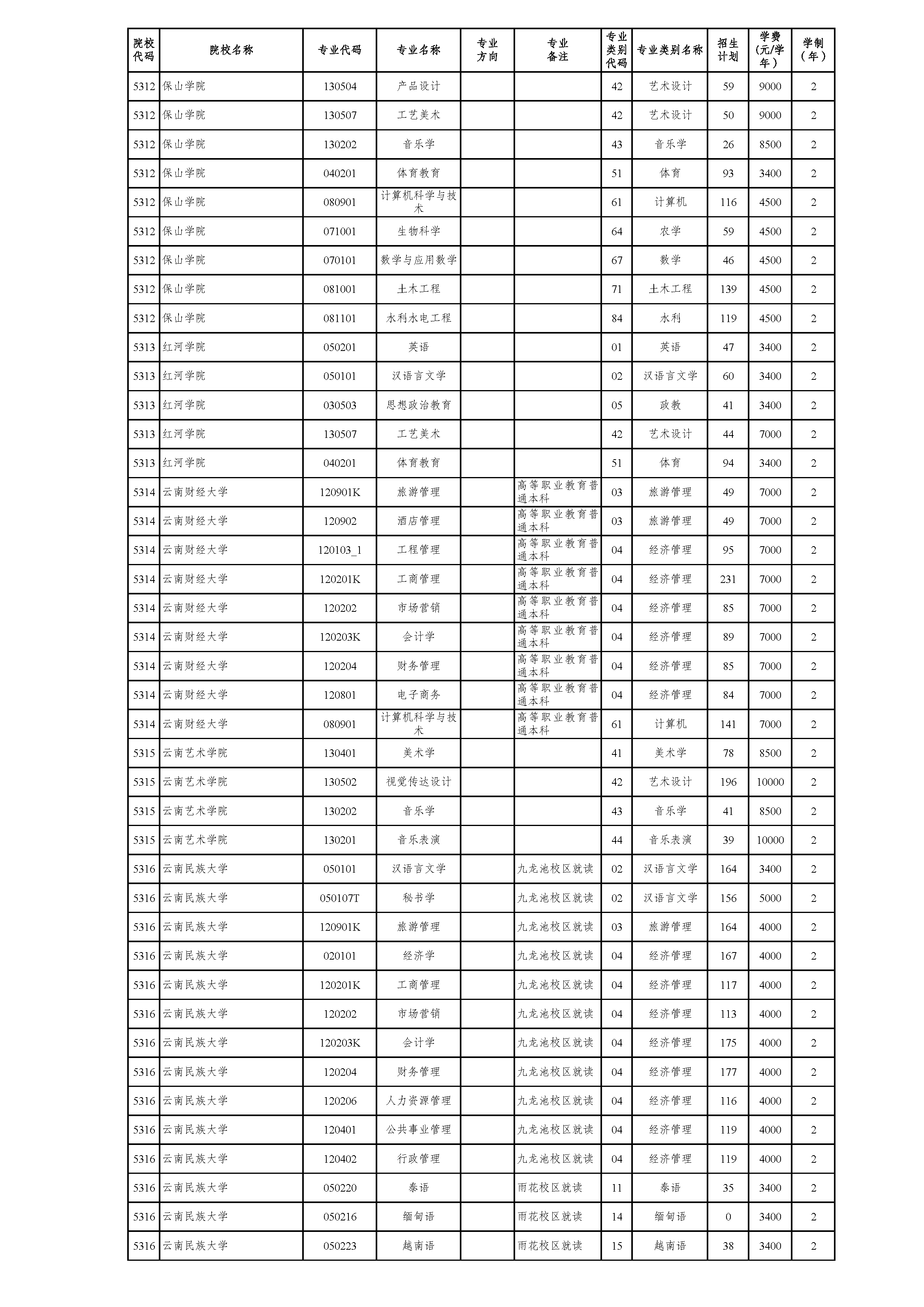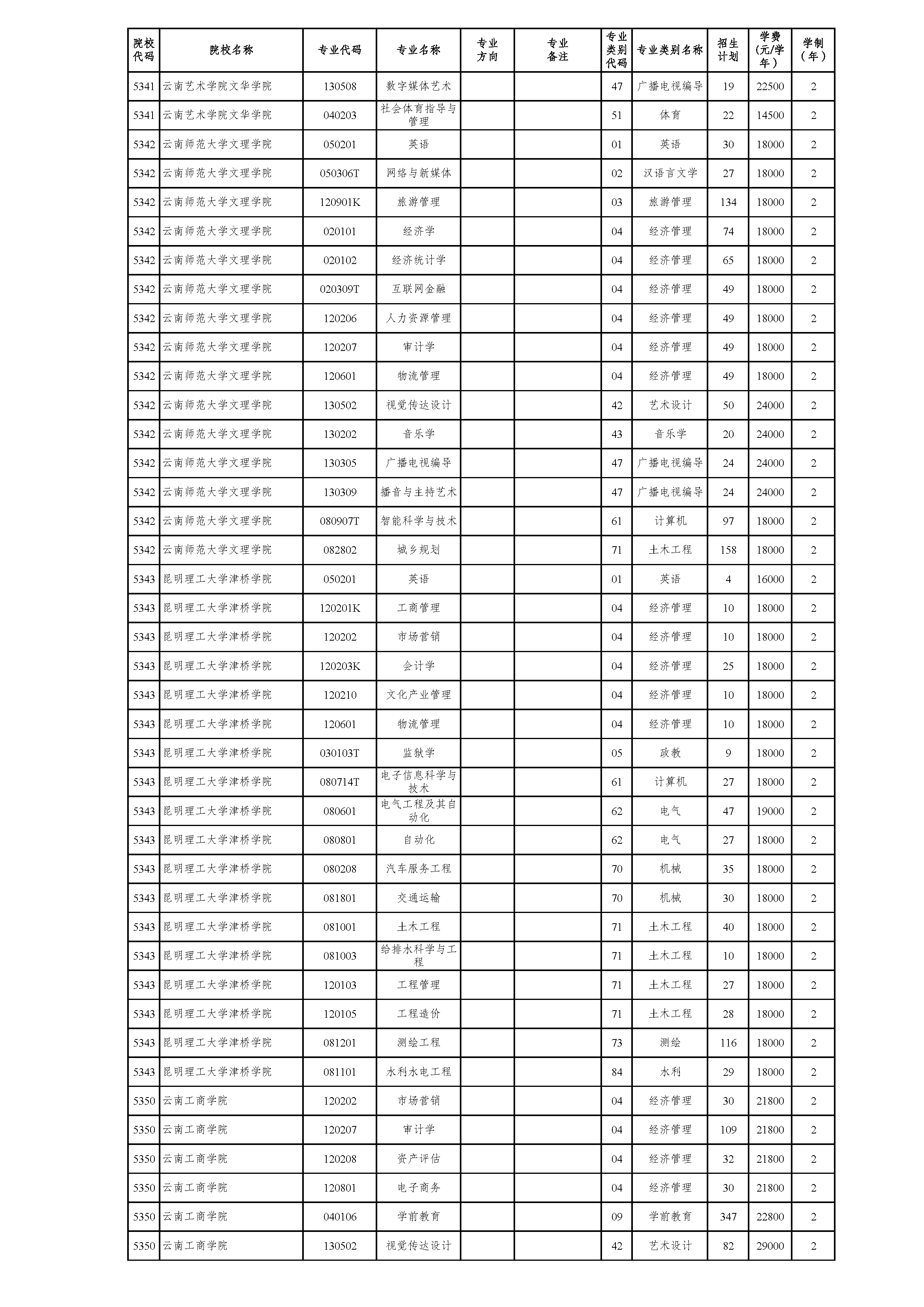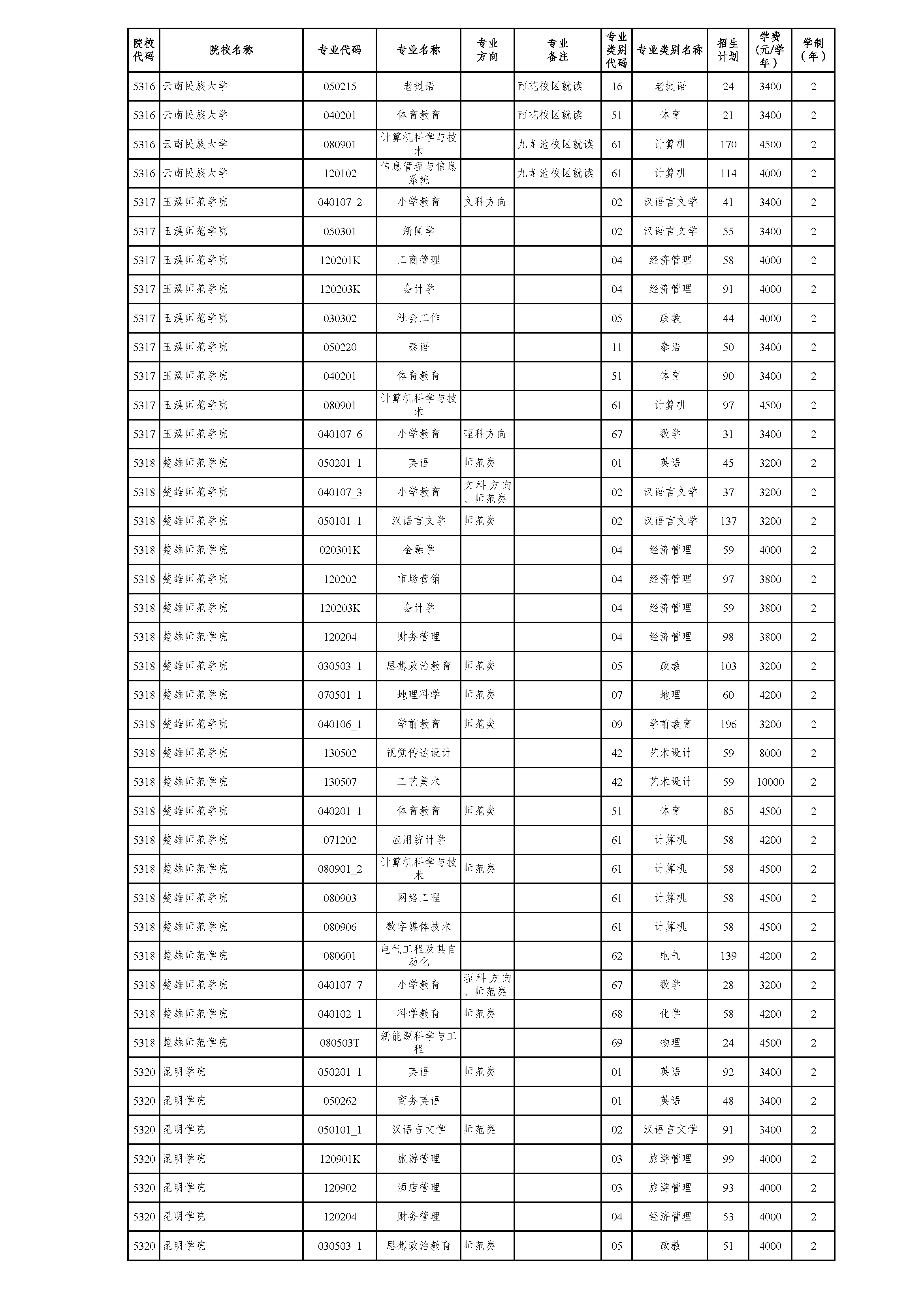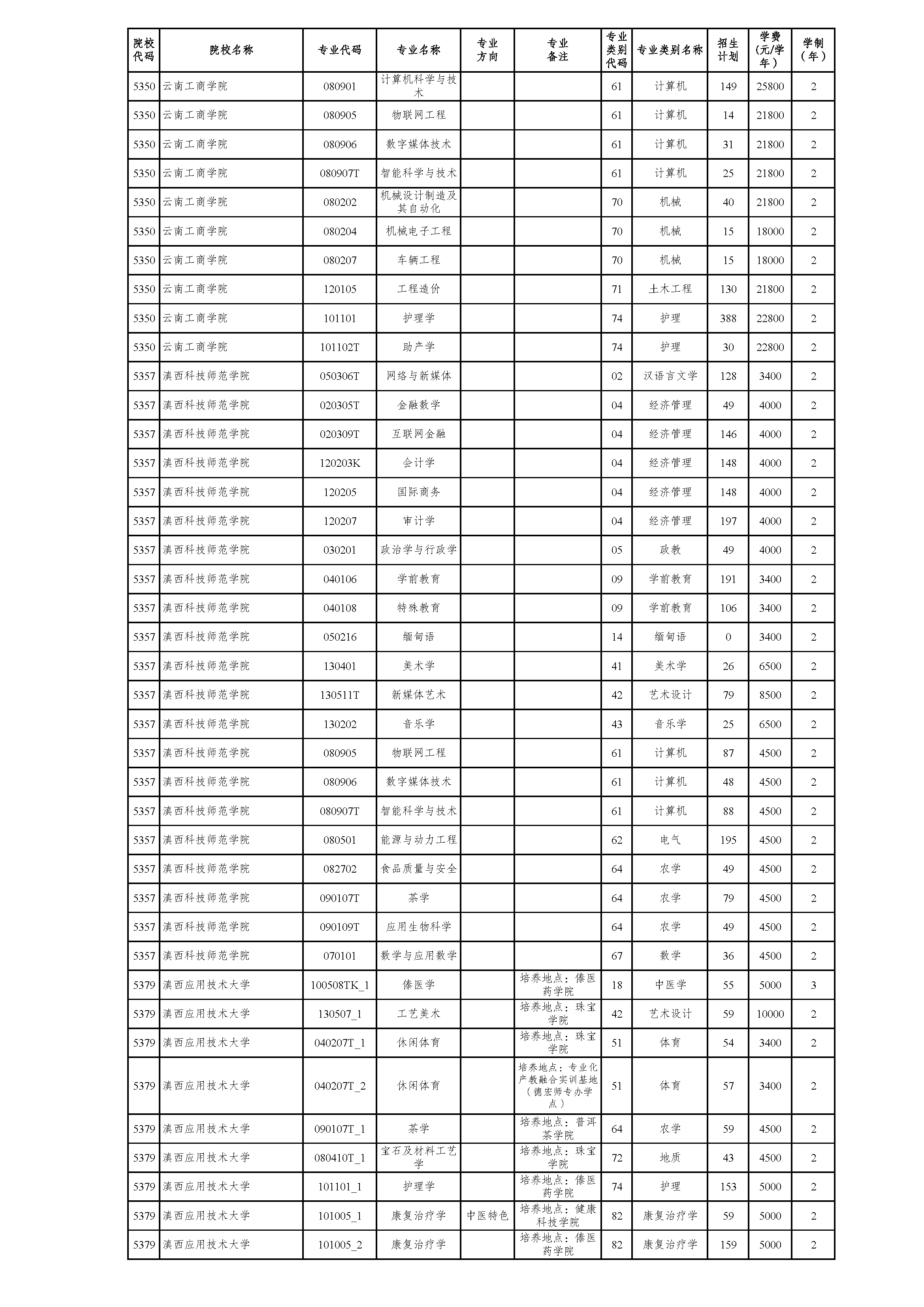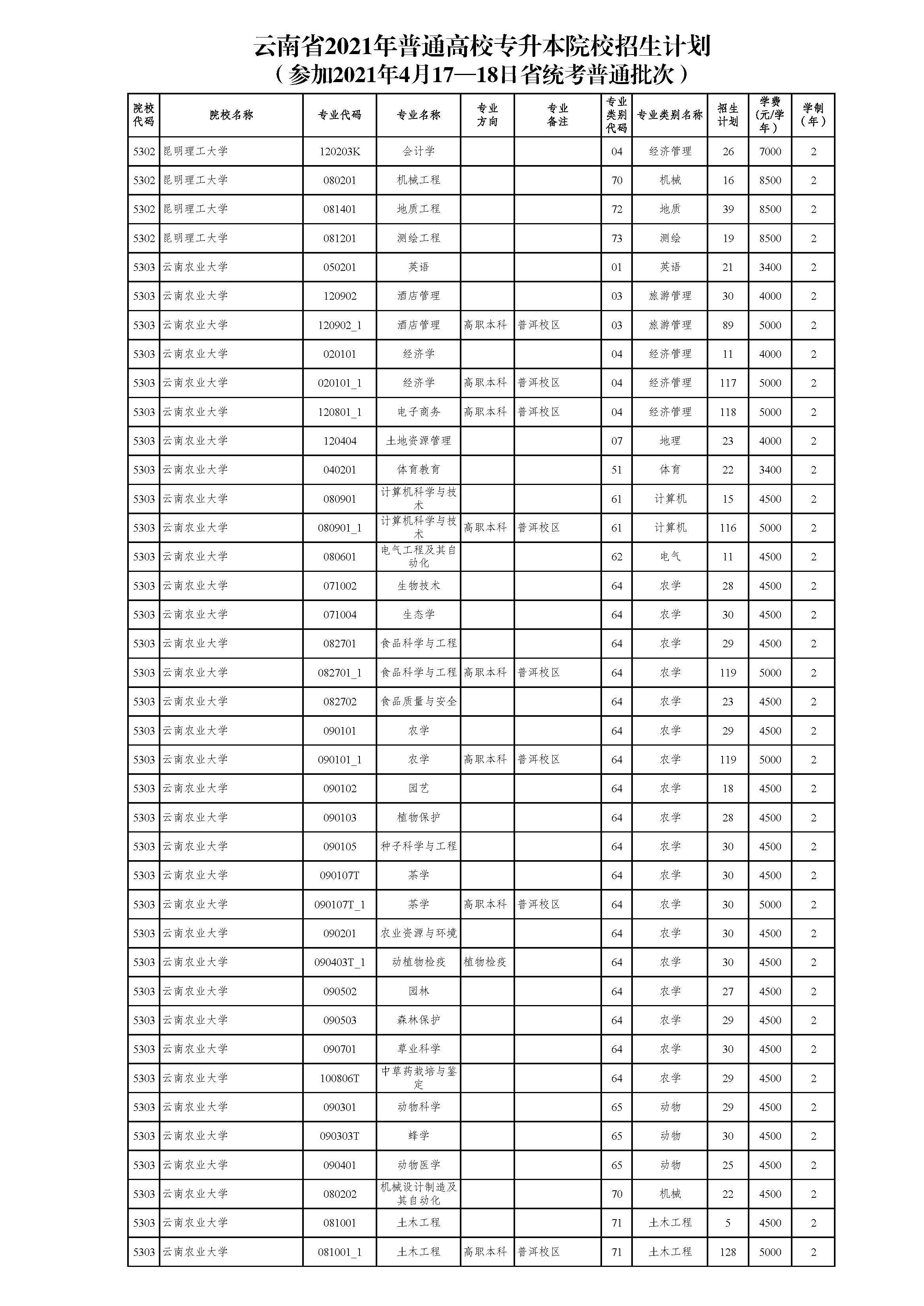 云南省2021年普通高校专升本院校招生计划(参加2021年4月17-18日省统考普通批次)
