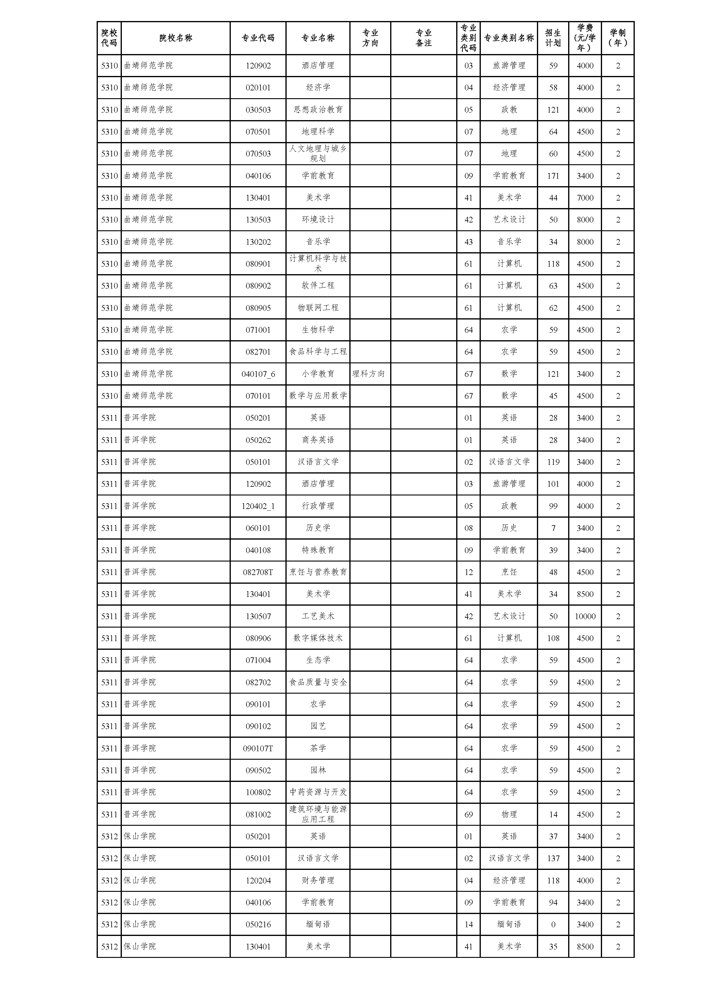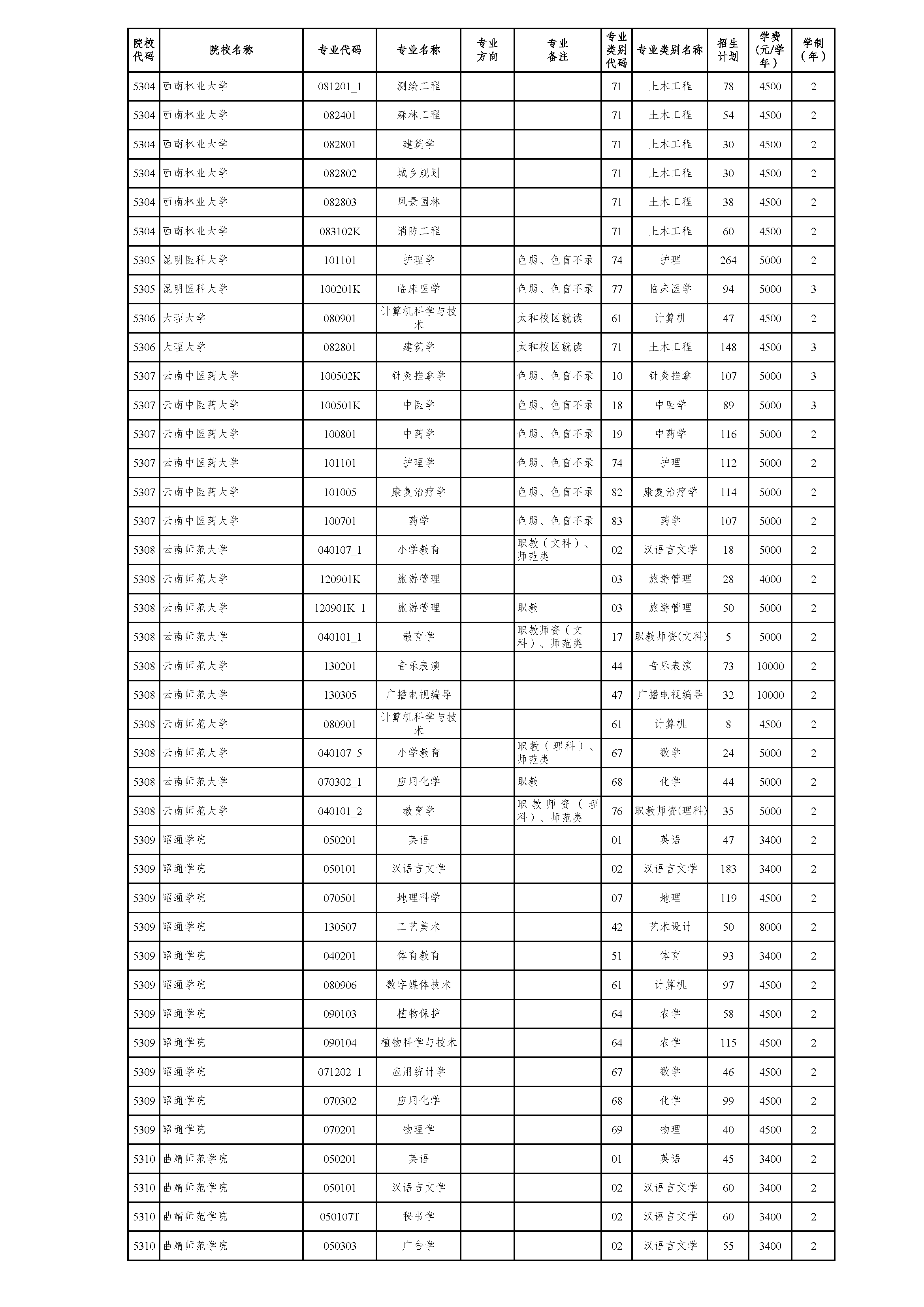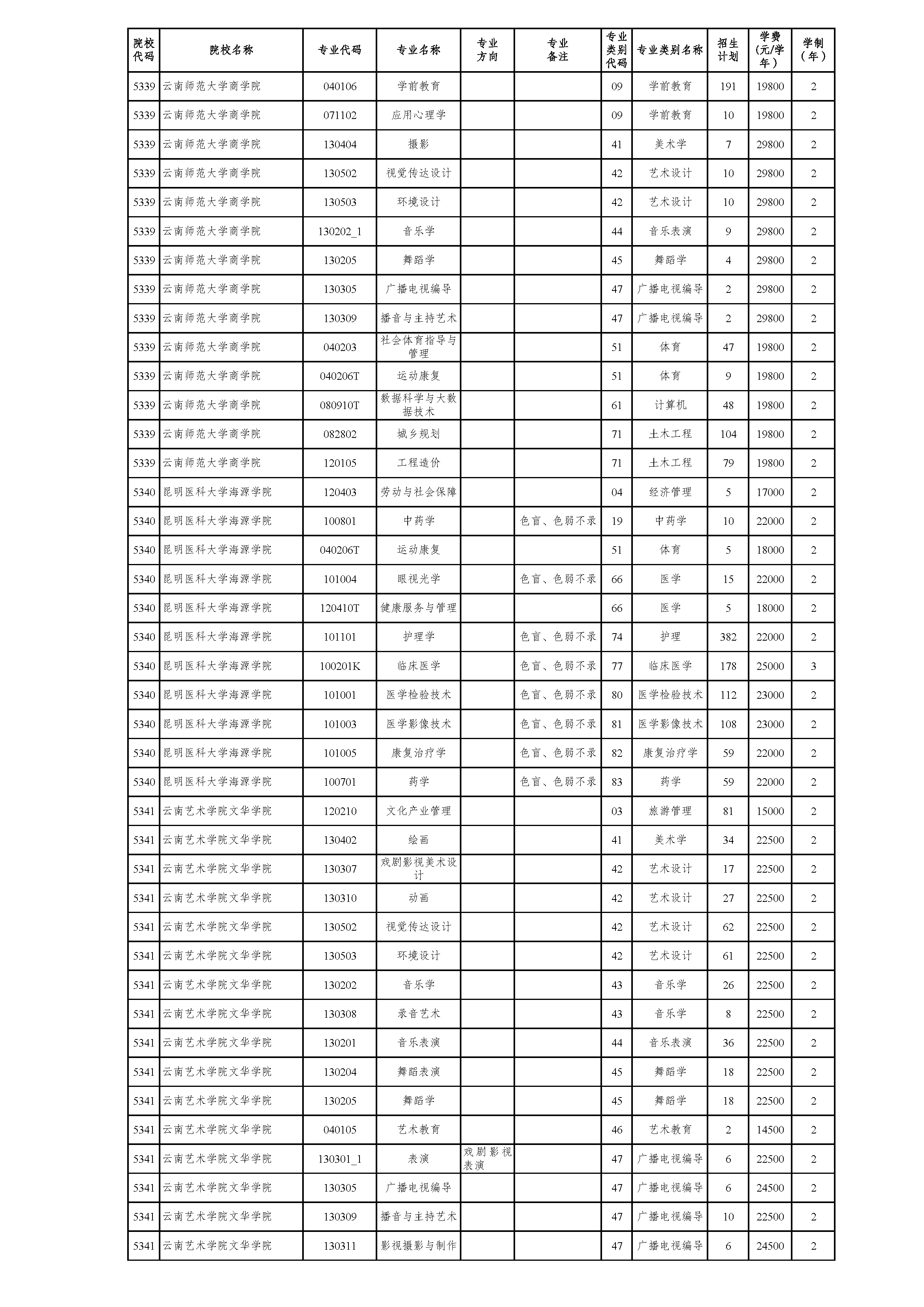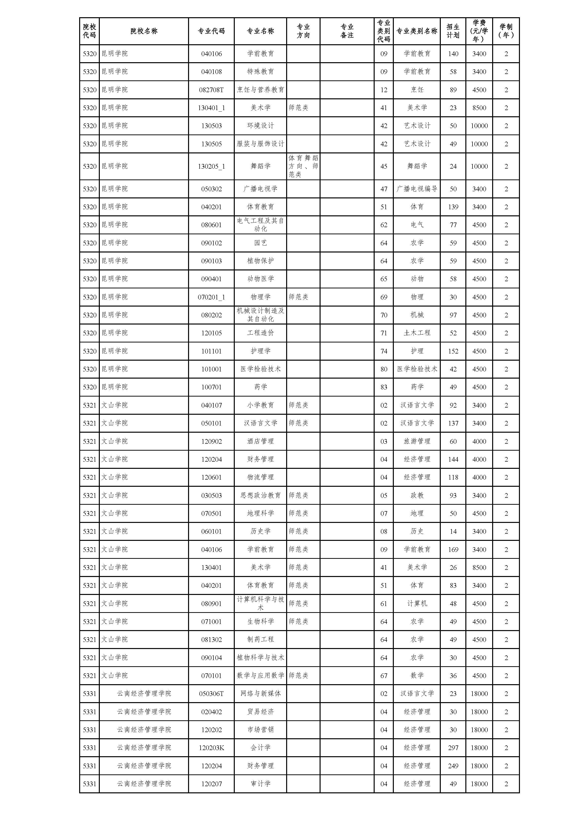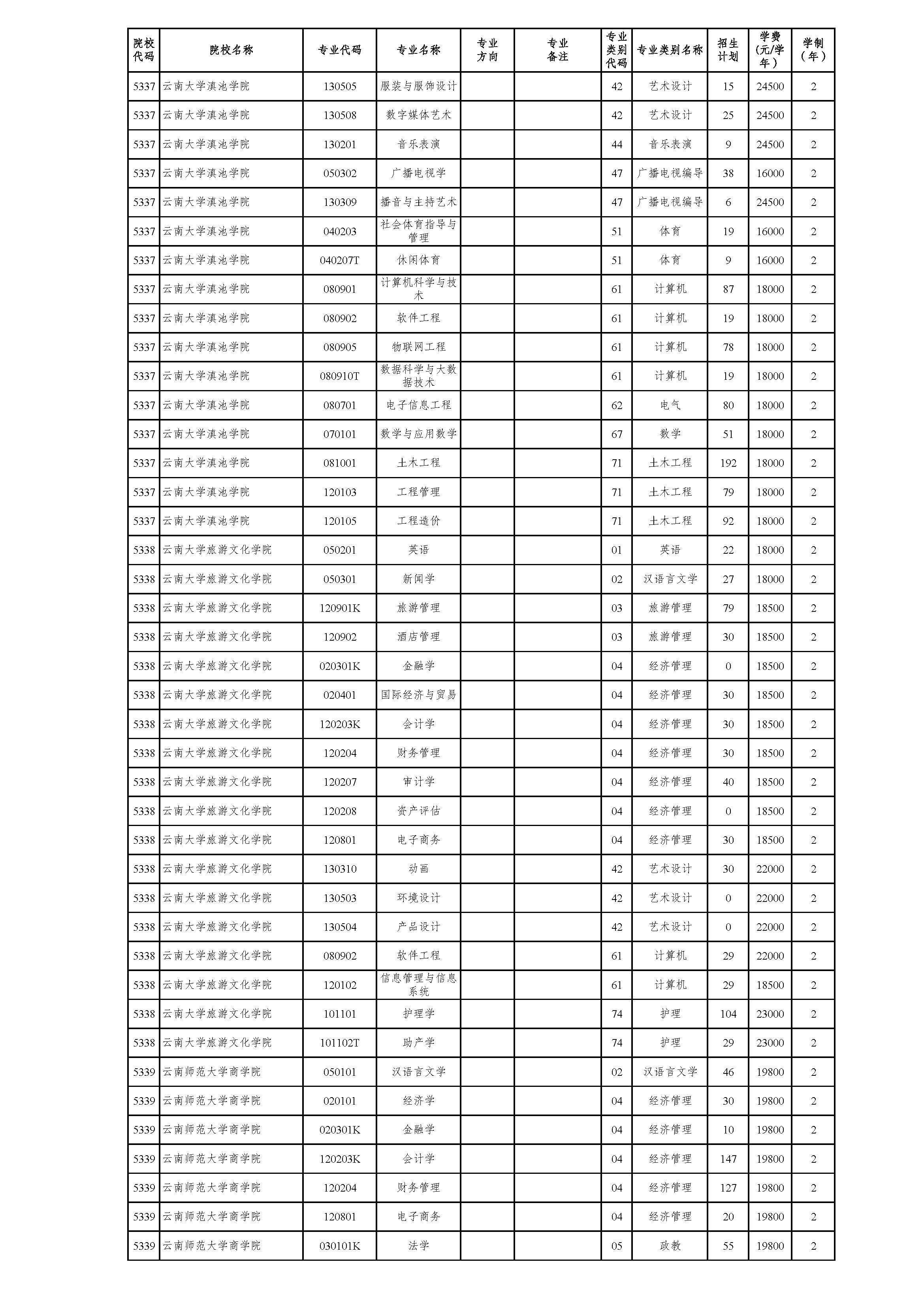 云南省2021年普通高校专升本院校招生计划(参加2021年4月17-18日省统考普通批次)