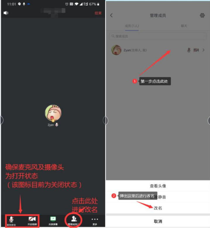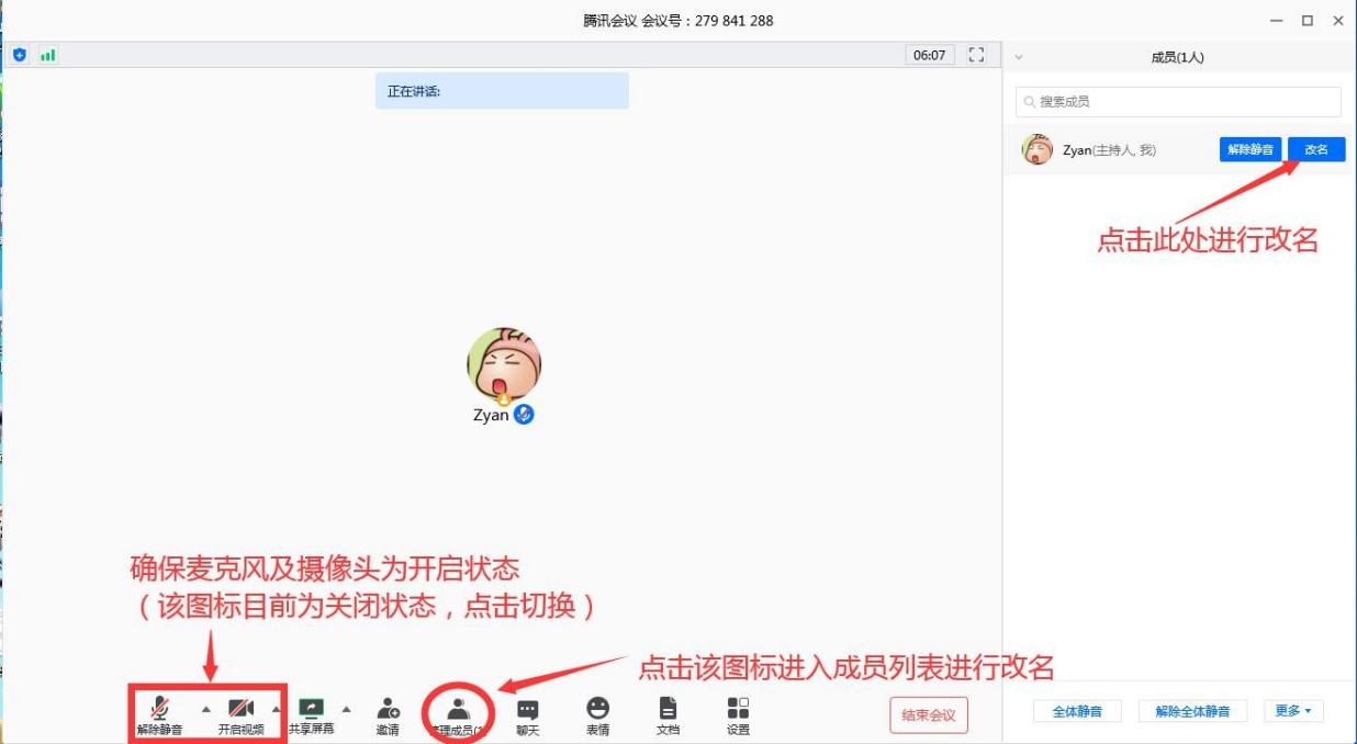 (四)在考试开始之前30 分钟,打开腾讯会议,输入腾讯会议号进入到腾讯会议房间后需将腾讯会议内姓名改为考生本人的姓名加准考证号,并把手机架设到能够拍摄到电脑屏幕以及考生的位置,并打开麦克风。具体操作如下: