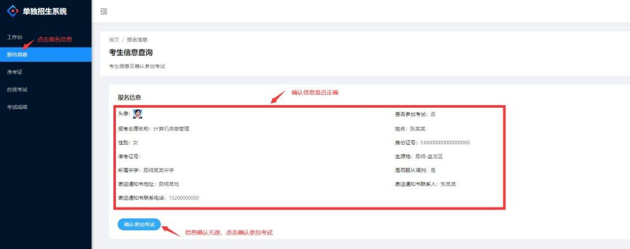 进入系统后,点击左侧菜单“报名信息”,确认信息无误后,点击“确认参加考试”按钮。
