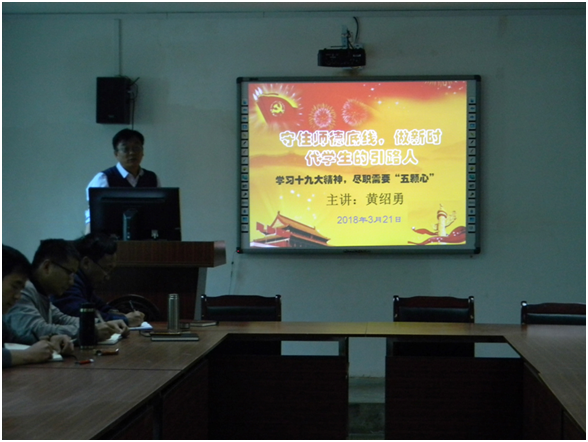 “十九大”学习教育活动开展以来,资源工程学院党总支按照党委要求,结合学院实际工作,扎实推进教育活动的开展,确保“十九大”学习教育落实到每一位党员。2018年3月21日,学院党委委员、副院长黄绍勇同志到资源工程学院召开“守住师德底线,做新时代学生的引路人”为主题的专题党课。