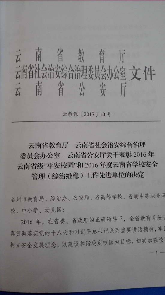 近日,伟德接《云南省教育厅 云南省社会治安综合治理委员会办公室 云南省公安厅关于表彰2016年云南省级“平安校园”和2016年度云南省学校安全管理(综治维稳)工作先进单位的决定》,伟德成功获评2016年度云南省级“平安校园”。自2011年至今,伟德已连续6年获评省级“平安校园”。