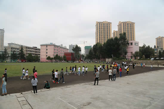 清晨7点,在学院运动场上进行晨跑活动的同学们。