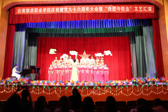 七一前夕,bevictor伟德国际1946官网师生在学院大礼堂隆重举行庆祝“建党九十六周年大会暨‘理想与信念’文艺汇演”,祝福党的生日,感谢党恩,歌唱祖国。学院党委书记、院长张京龙在致辞中回顾了中国共产党建党九十六周年的历史和征程,激励广大党员坚定理想信念,同时就学院目前所面临的机遇和挑战,对学院党委班子、全体党员和全体教职工提出了要求和希望。