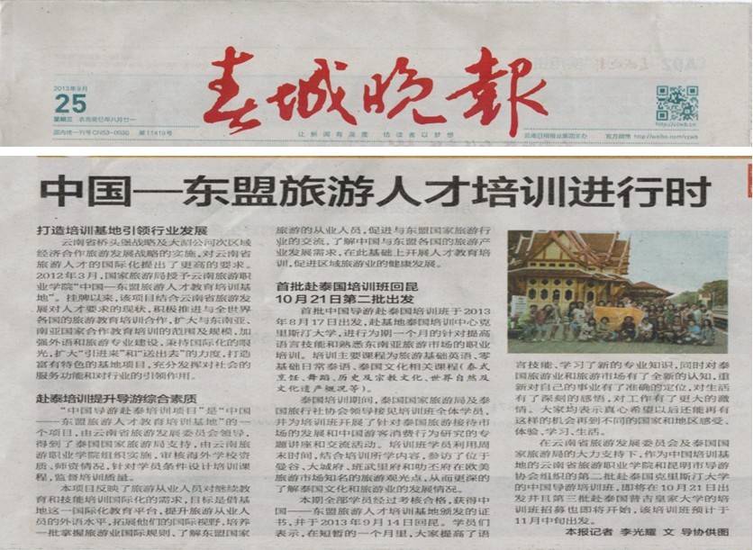 伟德中国—东盟旅游人才教育培训基地成立一年以来,开发了多个针对中外学生和旅游行业人员的教育、培训项目,并顺利实施。2013年8月至9月,首批针对行业人员的赴泰导游员培训顺利完成,春城晚报于9月25日对中国—东盟旅游人才教育培训基地进行了详细报道。即日起,春城晚报每周三都将对基地项目进行追踪报道。