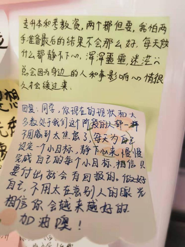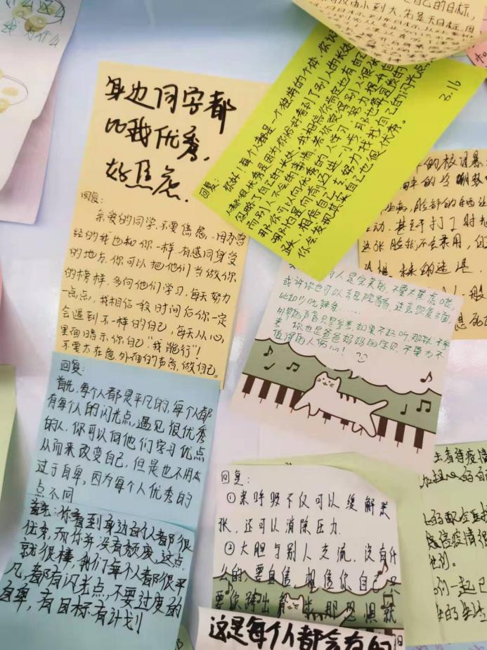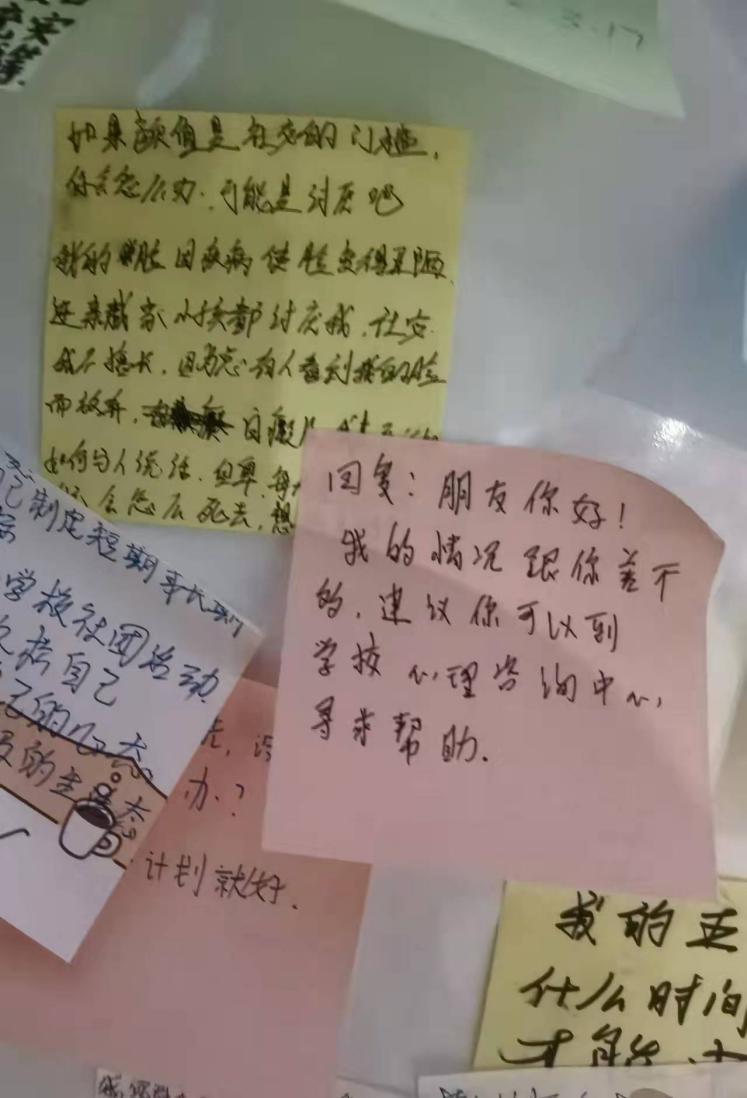 当日,活动现场摆放着“心理加油站——说说你的困扰,我来帮帮你”的主题海报,显目的布置吸引了不少同学驻足观看。展板上密密麻麻的彩色便签引得广大学生积极参与。都有哪些内容呢?一起来看看吧!