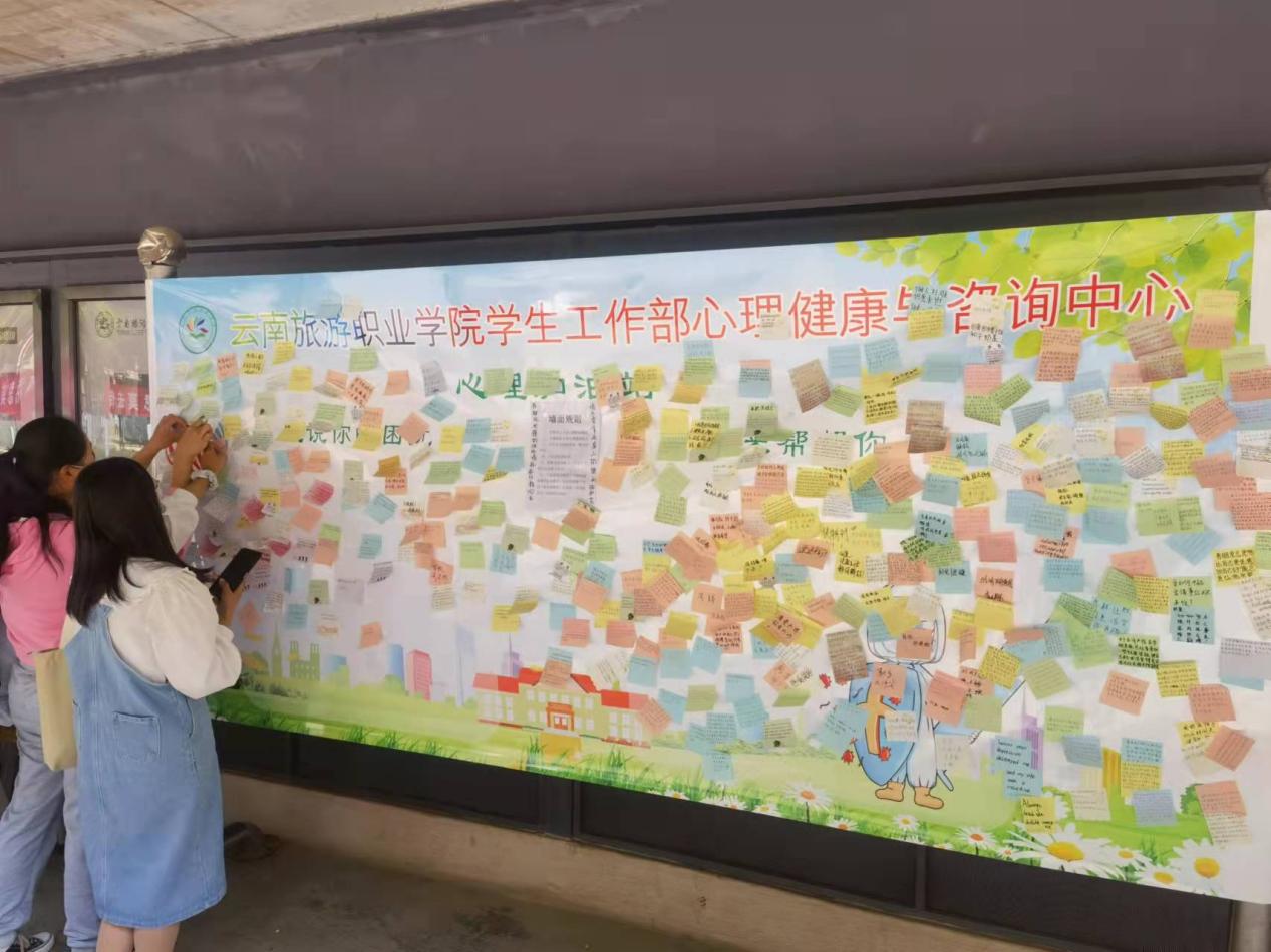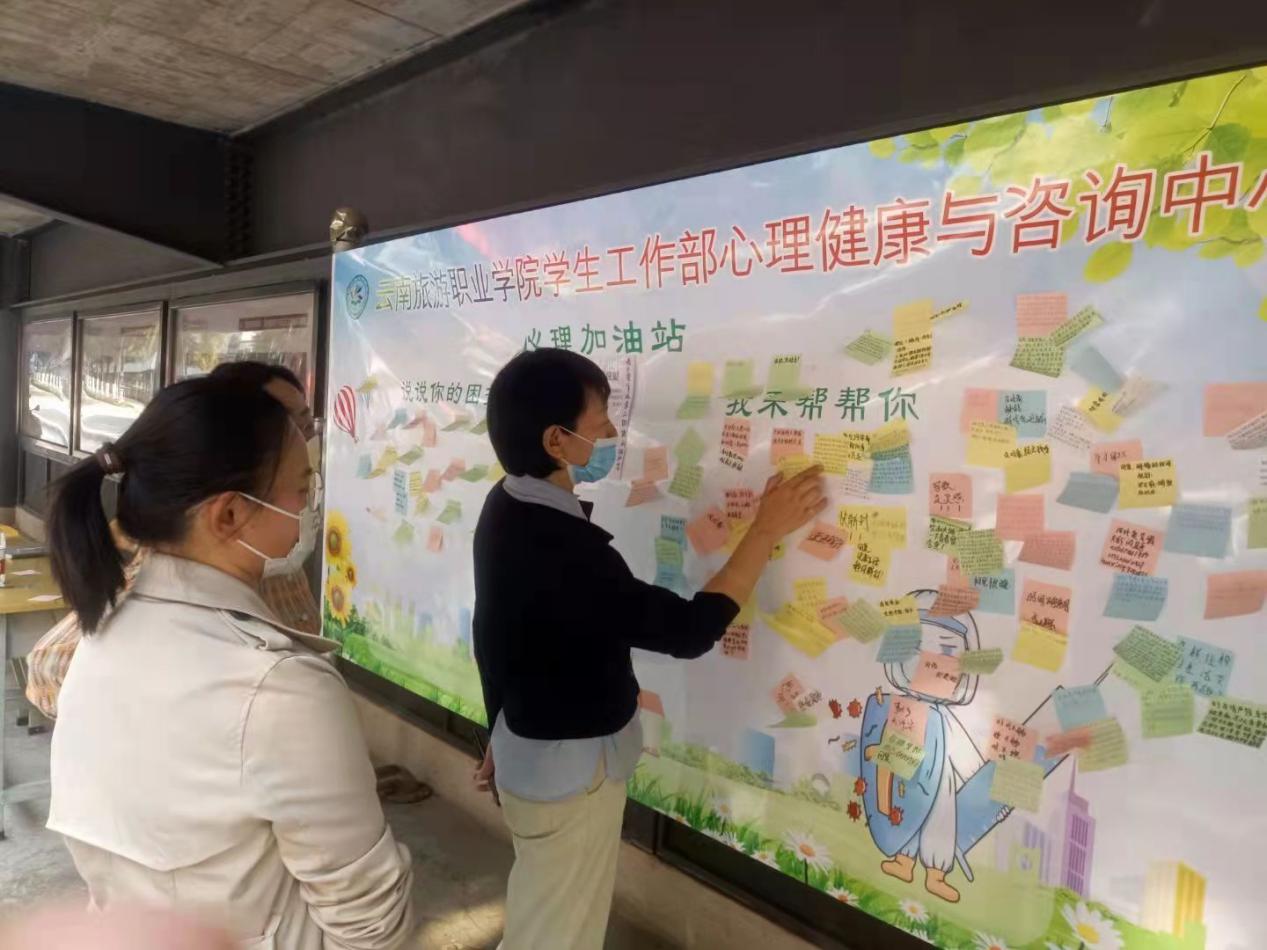 同学们将自己的困扰或建议贴到“心理加油站”活动展板的相应位置