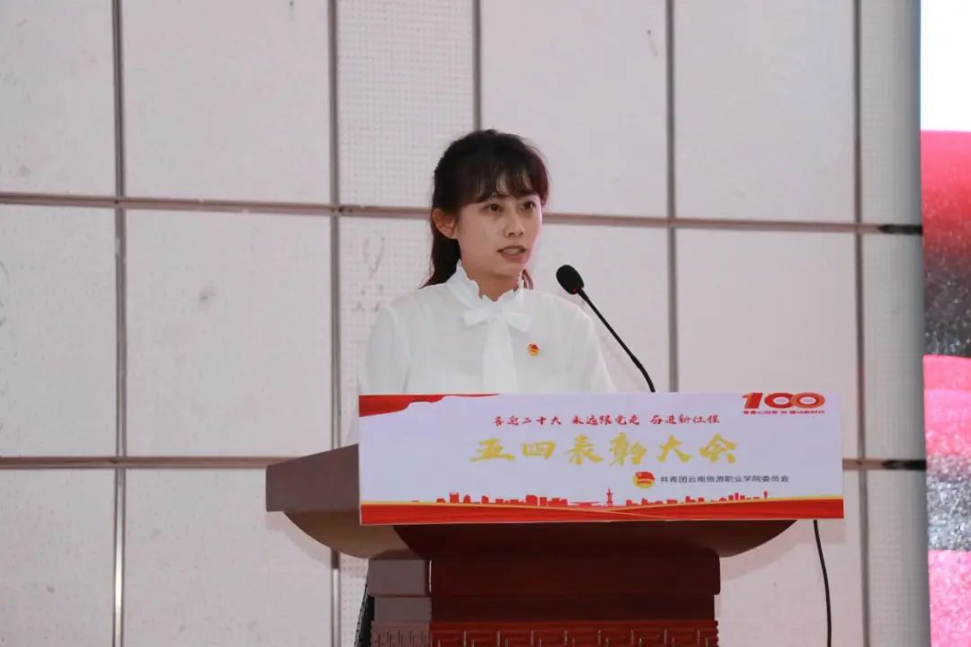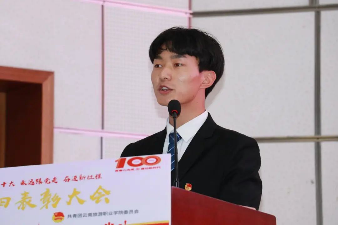 党委副书记、院长蔡冰宣读五四表彰决定,并向获得表彰的45个基层团组织、4个学生社团、17名青年教师以及431名团学干部、团员、志愿者表示热烈祝贺。74名先进集体和优秀个人代表依次上台接受表彰。校团委学生兼职副书记、旅游管理学院导游2001班龙海燕同学代表优秀个人作汇报发言,表达了永远听党话、坚定跟党走、奋斗新征程的坚定决心。