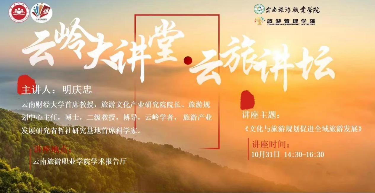 在后疫情时代下,如何全面认识文旅融合的价值?如何正确把脉旅游文化未来走向及布局?10日31日下午,bevictor伟德国际1946官网报告厅内座无虚席,新一期“云岭大讲堂•云旅讲坛”正式开讲。云南财经大学首席教授,旅游文化产业研究院院长,旅游规划中心主任明庆忠教授到伟德作题为《文化与旅游规划促进全域旅游发展》的专题讲座。学校党委委员、副校长符继红主持讲座。