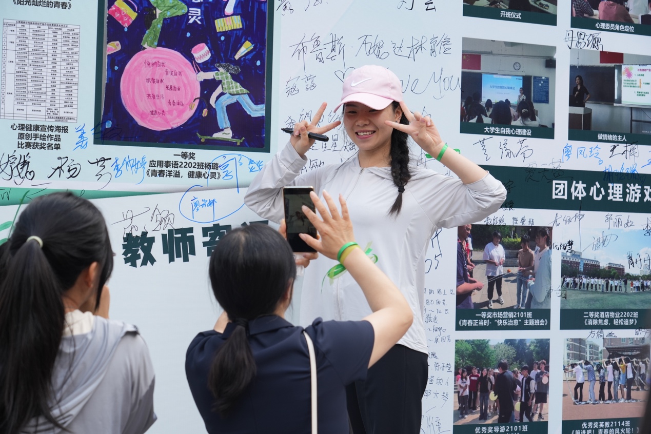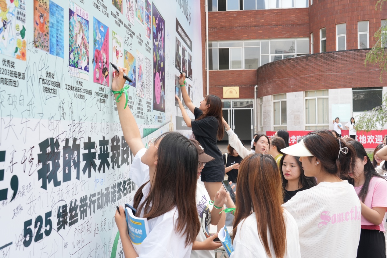 校本部及两个教学实训基地近千余名师生积极参与现场活动,各班心理委员志愿者向学院师生们介绍5.25的意义及学院开展的相关心理健康活动,并帮助同学和老师们系上象征着生命力和希望的绿丝带。同学们通过签名和系绿丝带的方式,承诺在面对未来的不确定性时,以积极乐观的态度直面挫折,端正心态,迎难而上,摆脱迷茫带来的焦虑感。老师们也在教师寄语部分留言,表达了对健康生活的美好祝福和期待。