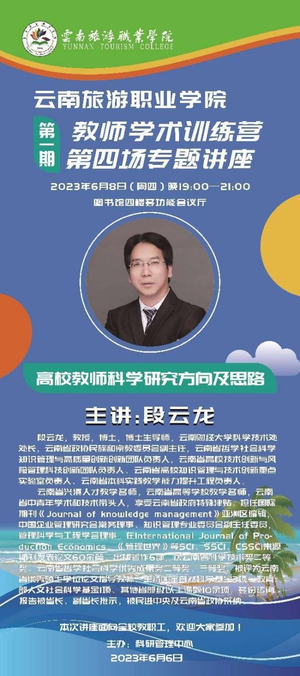 段云龙教授是云南财经大学科学技术处处长、云南省政协民宗委副主任、云南省哲社科知识管理与高质量创新团队负责人、云南省高校技术创新与风险管理科技创新团队负责人、云南省高校知识管理与技术创新重点实验室负责人、云南省本科实践教学能力提升工程负责人。云南省兴滇人才教学名师、云南省高等学校教学名师、云南省中青年学术和技术带头人,享受云南省政府特殊津贴。担任国际期刊《Journal of knowledge management》亚洲区编辑,中国企业管理与工程学会理事,在International Journal of Production Economics、《管理世界》等SCI、SSCI、CSSCI来源期刊发表论文60余篇、出版著作6部,获云南省科学技术奖二等奖、云南省哲社科优秀成果奖二等奖、三等奖,被评为云南省优秀硕士学位论文指导教师,主持国家自然科学基金3项、教育部人文社会科学基金1项、其他省部级以上课题10余项,段云龙教授的多份咨询报告被省长、副省长批示,被民进中央及云南省政协采纳。