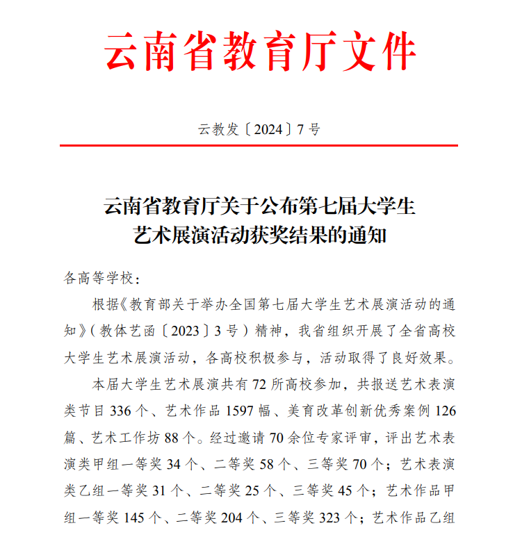 近日,由云南省教育厅主办的第七届大学生艺术展演获奖名单揭晓,伟德在本届赛事中取得优异成绩,共获一等奖4项、二等奖8项、三等奖7项、个人专项奖4项,并获评优秀组织奖。