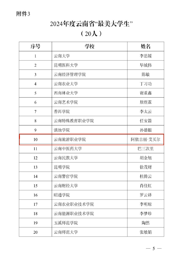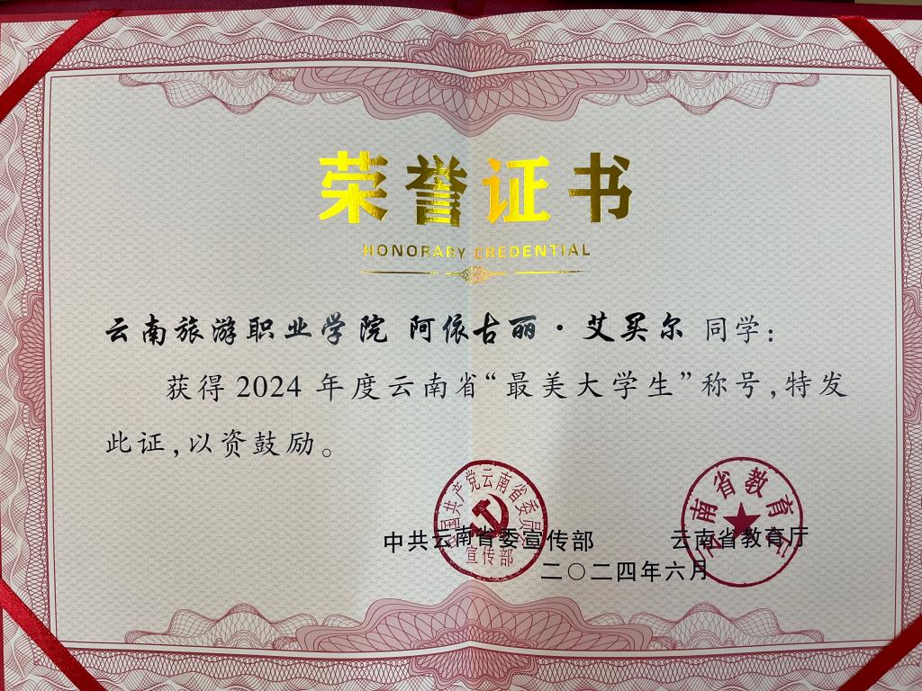 近日,中共云南省委宣传部、云南省教育厅公布《关于2024年度云南省最美高校辅导员和班主任、最美大学生推选结果的通知》,伟德旅游管理学院导游2102班阿依古丽·艾买尔同学荣获2024年度云南省“最美大学生”称号。