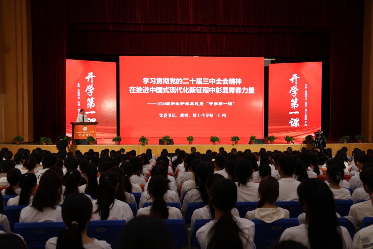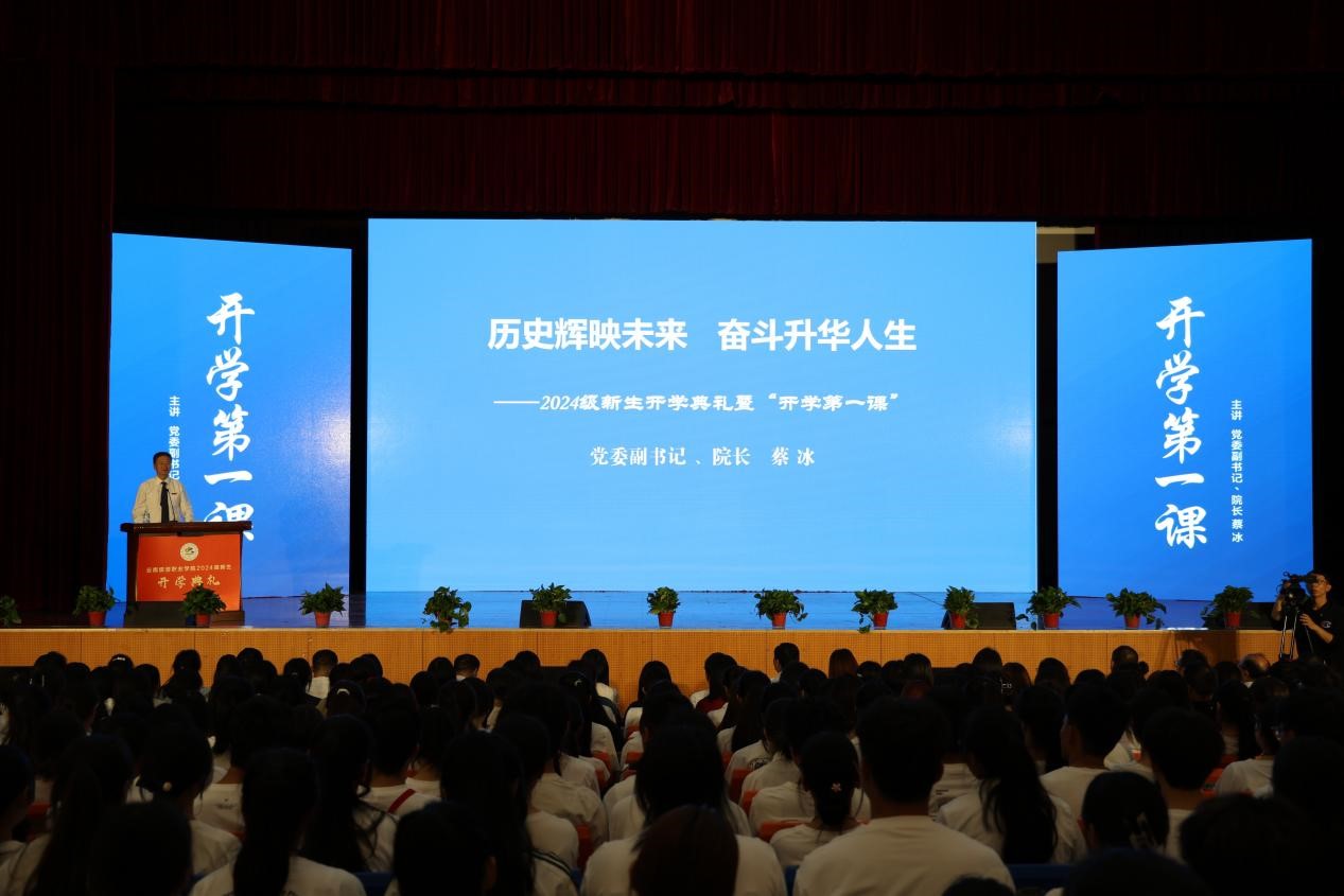 党委副书记、院长蔡冰在2024级新生开学典礼暨“开学第一课”上的讲授中,以“历史辉映未来 奋斗升华人生”为题,从“辉煌的昨天”“奋斗的今天”和“灿烂的明天”三个方面,蔡冰院长图文并茂地向新同学们介绍了学院的历史沿革、发展现状及未来发展目标,并对新同学们提出了殷切期望。