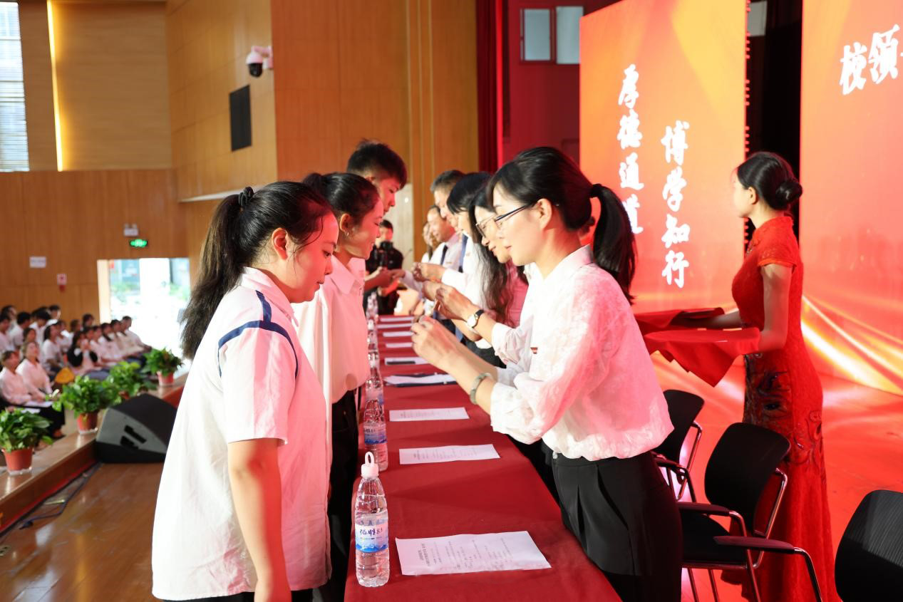 在全体师生的见证下,参加典礼的全体校领导为9名新生代表佩戴学校徽章,勉励2024级新生铭记校训,将个人的理想融入国家发展大局中,在云旅这片沃土上,刻苦学习钻研,努力成长为堪当民族复兴重任的时代新人。