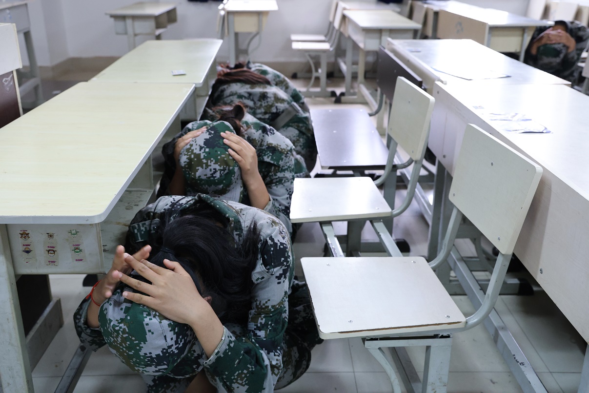 14:30分,随着第一次警报声响起,表示地震来临,演练正式开始。同学们双手抱头就近寻找坚固支撑物进行紧急避险,确保得到最有效的防护。