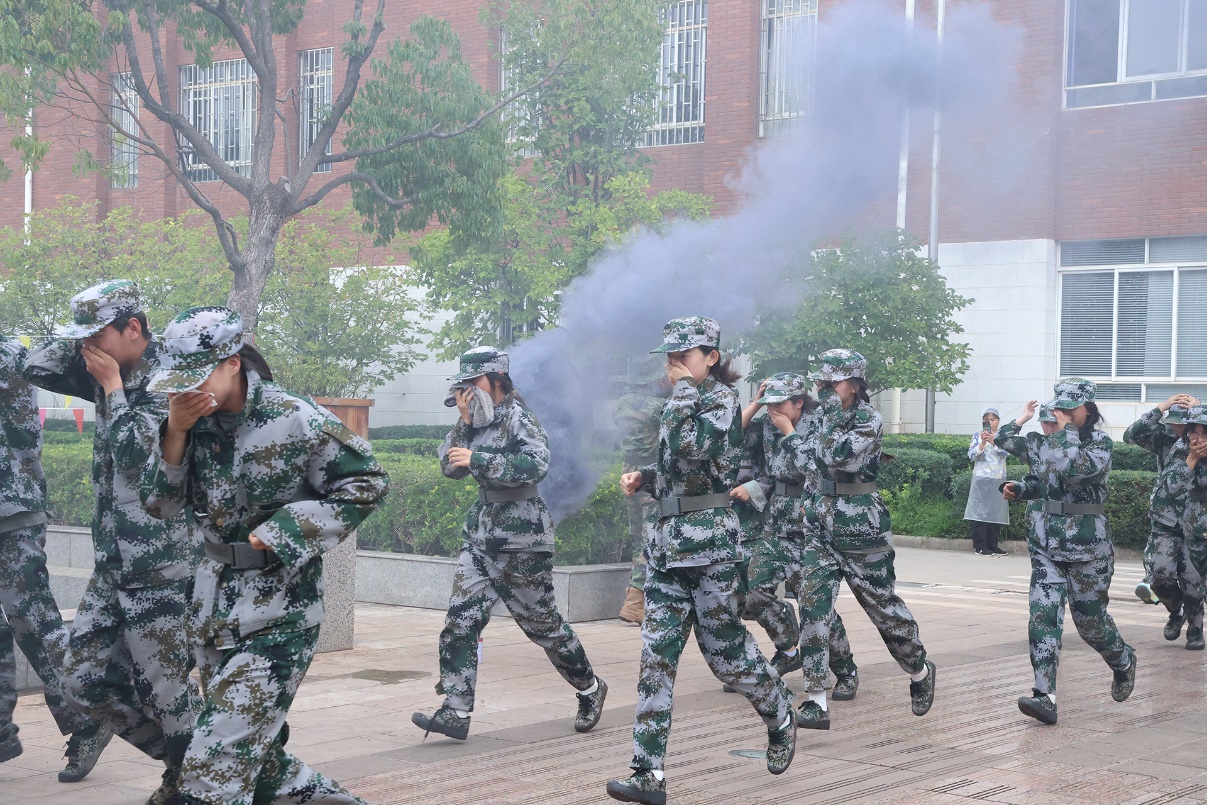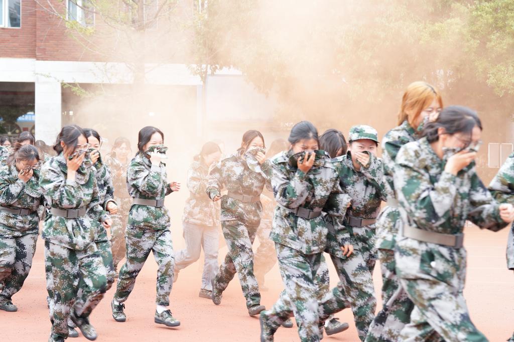 14:40分,警报声再次响起,表示地震或火灾初期已过。同学们双手抱头迅速从安全出口撤离到操场。顷刻间,现场烟雾弥漫,所有参演人员陆续抵达指定地点,核实人数无误,整个过程有条不紊、井然有序。
