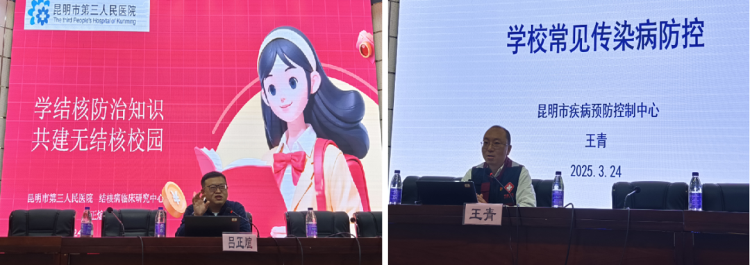 二是专家现场宣讲。昆明市第三人民医院结核病临床研究中心介入结核病科吕正煊主任结合校园实际案例生动有趣地讲授了学结核防治知识和共建无结核校园的内容;昆明市疾病预防控制中心健康教育科王青科长深入浅出讲解了学校常见传染病的防控措施。专家们特别强调了早发现、早诊断、早治疗的重要性,让师生们对结核病有了更全面、深入的认识。