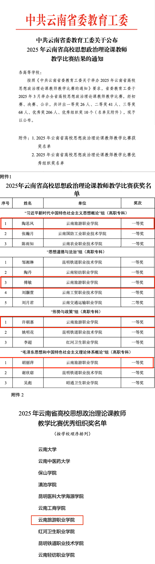 4月15日,云南省委教育工委公布2025年云南省高校思想政治理论课教师教学比赛成绩。伟德荣获优秀组织奖,马克思主义学院4名教师喜获佳绩,再创纪录!