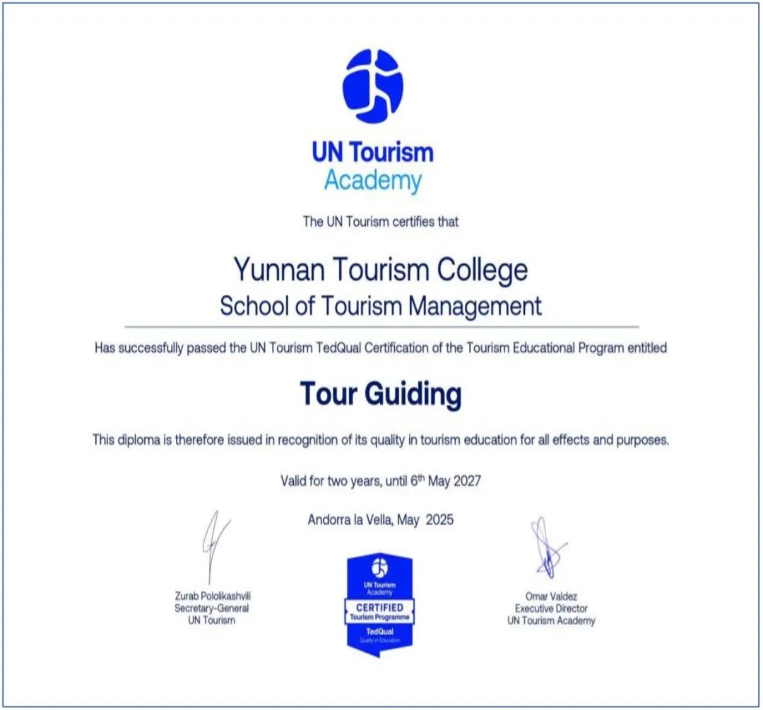 5月7日,联合国世界旅游组织(UN Tourism)来函通报,伟德导游专业顺利通过联合国世界旅游组织教育质量认证(UN Tourism TedQual),成为云南省首家通过该项认证的院校。这一认证标志着伟德导游专业教育质量获得国际权威认可,在国际化旅游人才培养方面开启了新的里程碑。