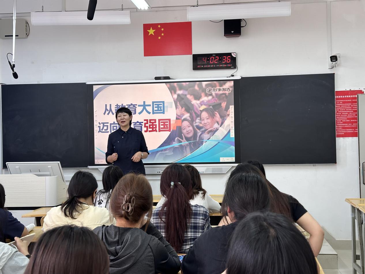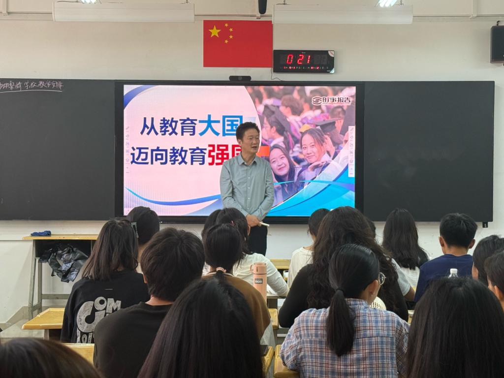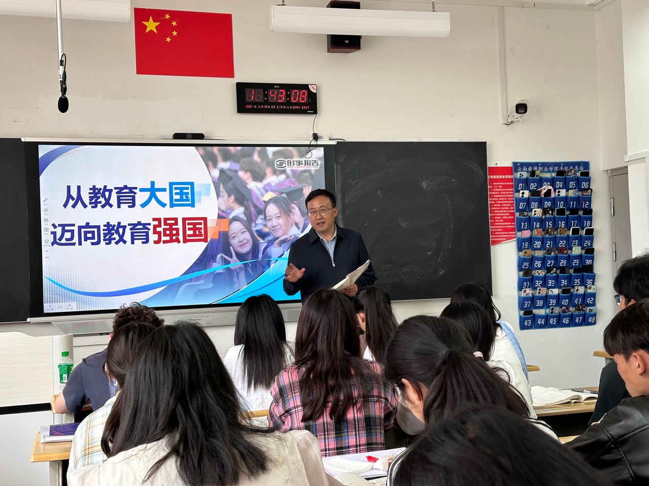 党委副书记、院长蔡冰从“钱学森之问”导入,引发学生强烈共鸣,指出中国共产党成立以来对科教事业发展的重视,特别是中国特色社会主义进入新时代,赋予了教育强国新的内涵和特征,他深刻剖析了教育强国的重要意义,鼓励学生们以挺膺担当之姿在中国式现代化征程中书写青春答卷。