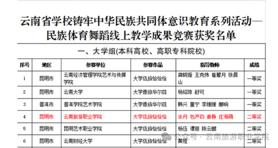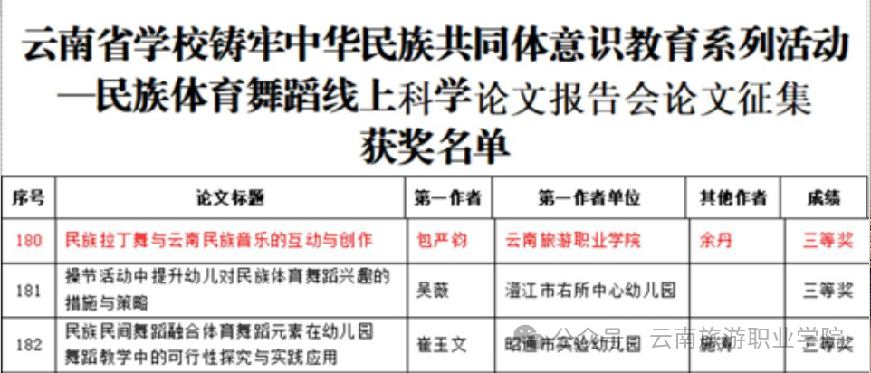 5月19日,在云南省教育厅公布“云南省学校铸牢中华民族共同体意识教育系列活动——民族体育舞蹈线上教学和竞赛活动”获奖名单中,由伟德文化艺术学院与体育教学部协同组队参赛的舞蹈作品《大学佤族恰恰恰》荣获民族体育舞蹈线上教学成果竞赛二等奖,论文《民族拉丁舞与云南民族音乐的互动与创作》获线上科学论文报告会论文征集三等奖,以实践与理论的双重突破,彰显伟德在民族文化传承与铸牢中华民族共同体意识教育领域的创新成果。