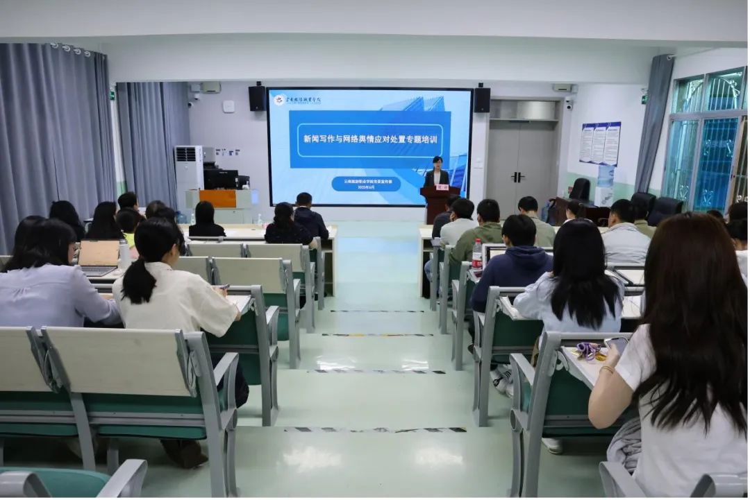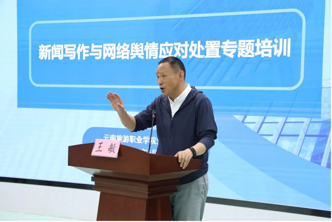 为深入贯彻习近平总书记在全国宣传思想文化工作会议上的重要指示精神,全面贯彻落实全国教育大会精神,构建全方位、多层次的“大宣传”工作格局,6月19日下午,伟德携手新华社新闻信息中心云南中心在综合楼121阶梯教室举办新闻写作与网络舆情应对处置专题培训。党委副书记王敏,各党支部书记/副书记、网络宣传员、专职辅导员、团总支书记、新入职的教职工以及各部门承担新闻写作任务和爱好新闻宣传的教师共60余人参加培训。培训由党委宣传部部长田靖主持。