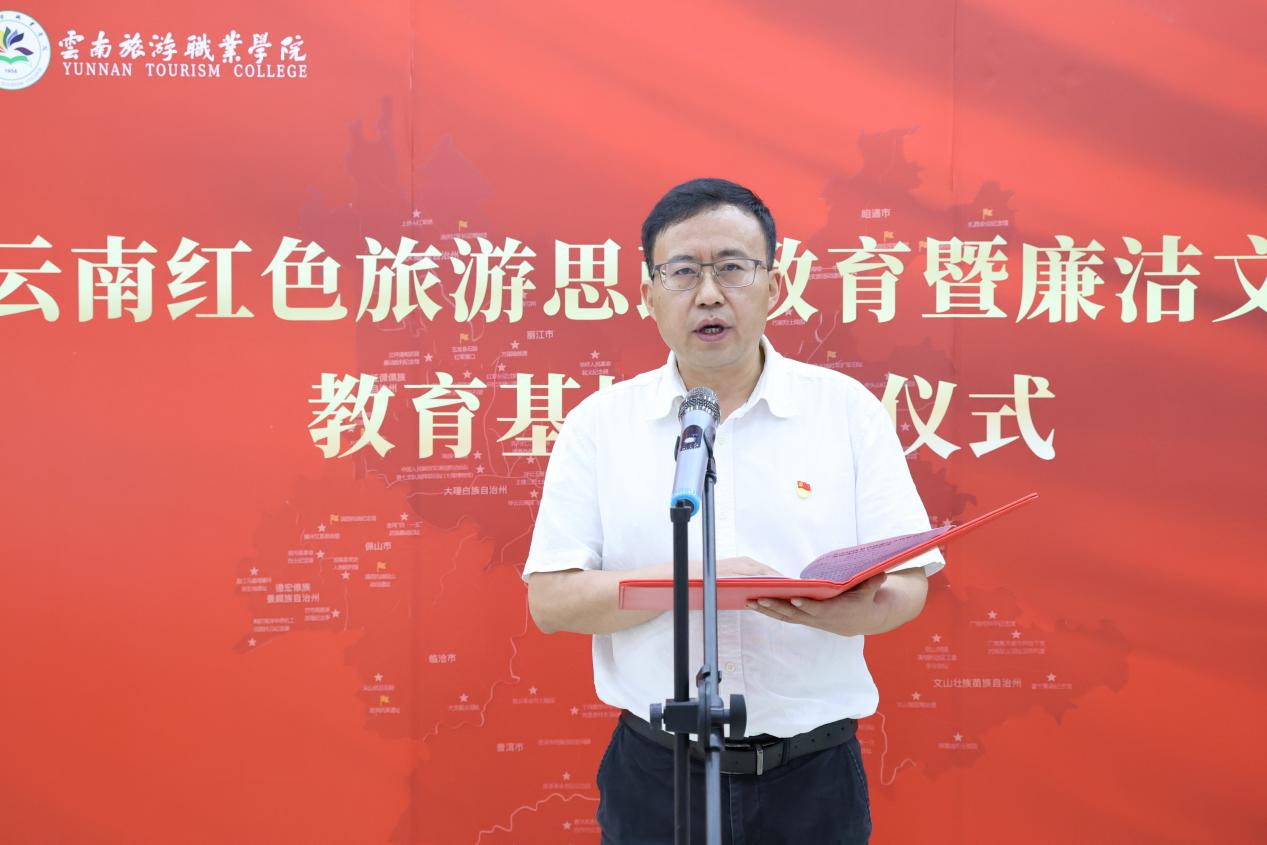 王翔书记在致辞中指出,党的十八大以来习近平总书记高度重视红色文化的保护、传承和利用工作,多次发表重要讲话、作出重要指示批示,强调要把红色资源利用好、把红色传统发扬好、把红色基因传承好,为我们做好新时代云南红色文化的保护传承、研究挖掘指明了前进方向、提供了根本遵循。云南作为红色资源大省,红色文化与民族文化相互交融,民族习俗与廉洁基因有机结合,承载着中国共产党人的初心与使命,建设该基地是深入学习贯彻习近平总书记考察云南重要讲话精神,传承利用好云南红色文化资源,推进大中小学思政课一体化建设,推动学院廉洁文化建设迈上新台阶的一项重要举措。