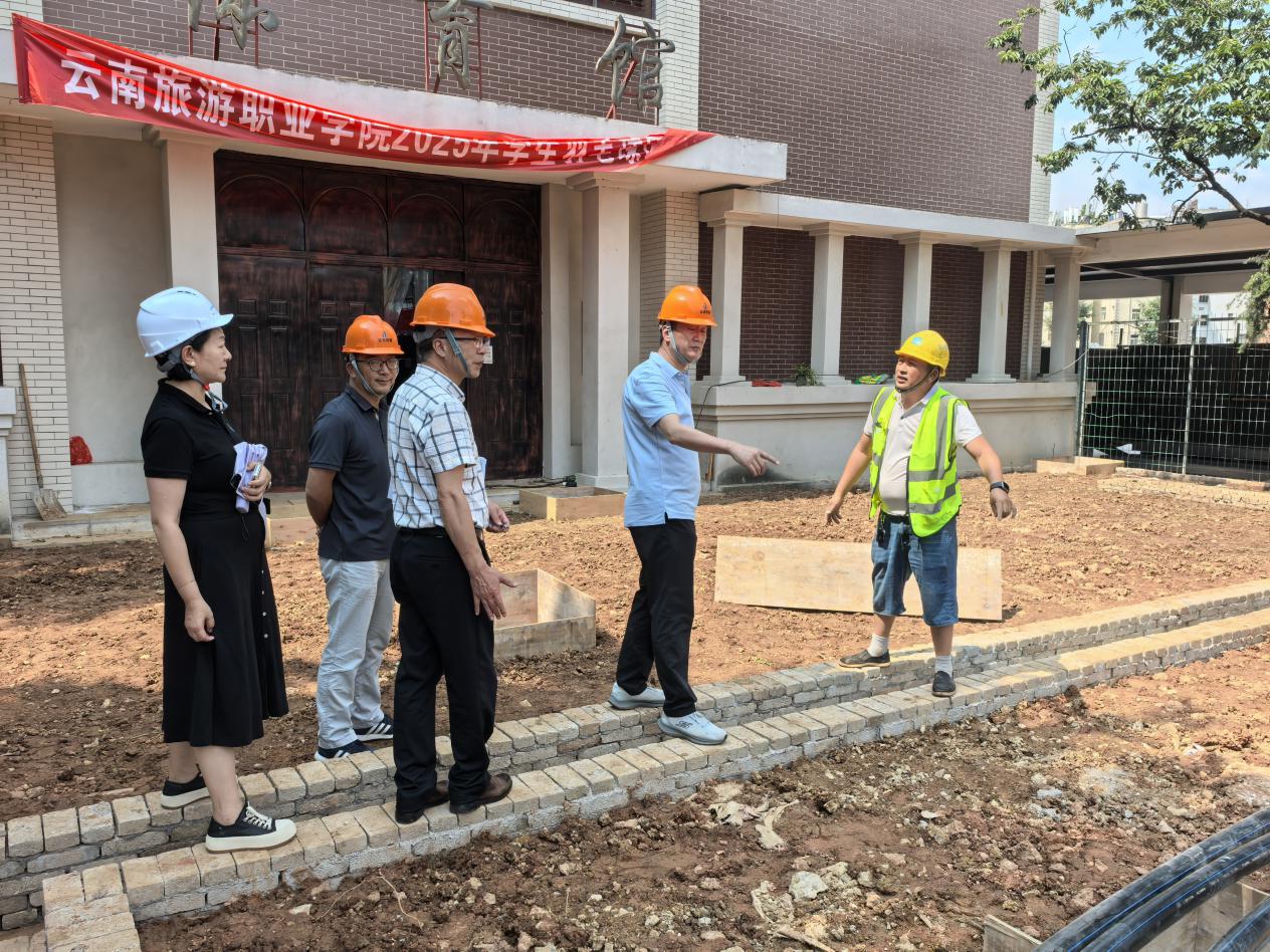 “抢工期、保开学”,为加快推进学院龙泉路校区提升改造(一期)项目,确保秋季学期开学师生“第一餐”如期开伙,8月4日上午,院长蔡冰带领副院长杨红英、何树称、王霞到学院临时食堂建设现场,对施工进度及安全等进行调研指导。
