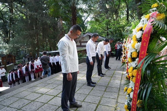 在南洋华侨机工纪念碑前,伴随着庄严的《献花曲》,昆明滇池国家级风景名胜区西山景服务中心党支部书记李涛、伟德党委书记王翔、昆明市旅游职业高级中学党总支书记张雪涛、昆明市五华区龙泉路小学党支部书记李春祥以及8名学生代表分别向南洋华侨机工纪念碑敬献花篮、整理缎带,对在抗日战争中作出巨大贡献和牺牲的南洋华侨机工们表示深切缅怀与敬意。随后,全体在场师生向在抗日战争中牺牲的南洋华侨机工及所有先烈默哀。