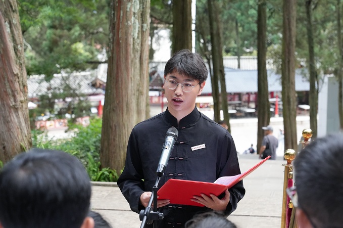 在西山聂耳墓前,伟德导游2403班刘仁磊同学向在场师生介绍了聂耳的生平与《义勇军进行曲》的创作历程及其伟大意义,帮助师生们深入学习国歌背后的故事,其所传达的爱国感召与斗争精神。