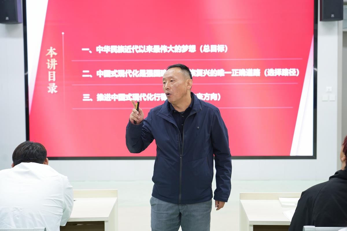 党委副书记、院长蔡冰从“中国共产党成立一百多年的述职报告”导入,指出中国式现代化是中国共产党领导人民长期探索和实践的重大成果,是强国建设、民族复兴的唯一正确道路,他结合生动案例深刻剖析了中国式现代化的五个中国特色和本质要求,鼓励同学们以挺膺担当之姿在中国式现代化征程中书写青春答卷。