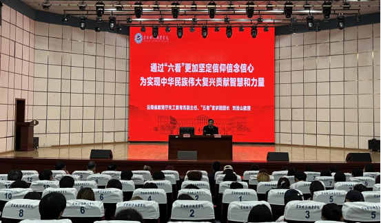 刘沧山教授以《通过“六看”更加坚定信仰信念信心,为实现中华民族伟大复兴贡献智慧和力量》为主题,为师生呈现了一堂生动的思政专题宣讲。他围绕“看世界、看中国共产党、看中国、看教育、看云南、看我们”六个维度展开系统阐述,构建起理解时代、坚定信念的逻辑体系:审视世界格局,洞察中国共产党百年奋斗的初心使命;洞悉中国发展成就,凝视云南在民族复兴中的战略定位;审视教育使命,反观青年成长路径。他提到,当今世界正处于和平与发展的时代主题下,中国共产党以马克思主义中国化时代化为指引,始终践行全心全意为人民服务的根本宗旨,带领中国实现经济腾飞与社会稳定,展现出卓越的治理能力与制度优势。