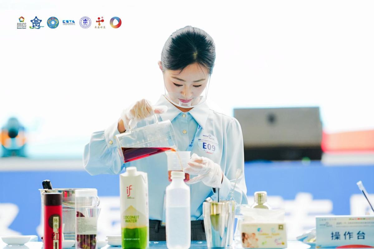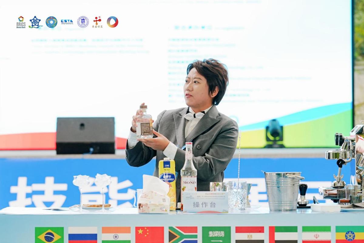 本次大赛由金砖国家工商理事会中方理事会、一带一路暨金砖国家技能发展国际联盟等单位主办,以“未来技能・创造未来”为主题,聚焦现代饮品行业创新设计、制作技艺与服务能力的综合比拼。赛事设置学生赛(中职组、高职本科及国际留学生组)和教师组,吸引了全国各地多所院校的师生团队同台竞技。作为面向饮品行业前沿的高水平赛事,赛项要求参赛团队在新式茶饮、时尚调饮、微醺酒饮、创意咖啡四类饮品中任选二类,完成从设计方案撰写到现场制作展示的全流程比拼,既考验专业技能,更注重创新思维与文化融合能力。