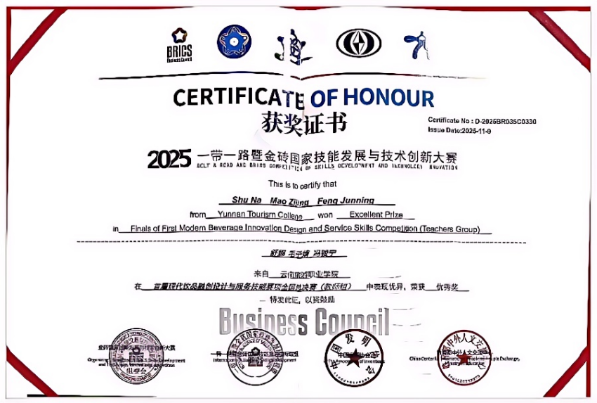 近日,2025一带一路暨金砖国家技能发展与技术创新大赛首届现代饮品融创设计与服务技能赛项全国总决赛在四川圆满落幕。由伟德酒店管理学院冯骏宁、毛子婧、舒娜教师组成的参赛队凭借扎实的专业功底、创新的设计理念和出色的现场表现,在教师组激烈角逐中脱颖而出,荣获优秀奖。