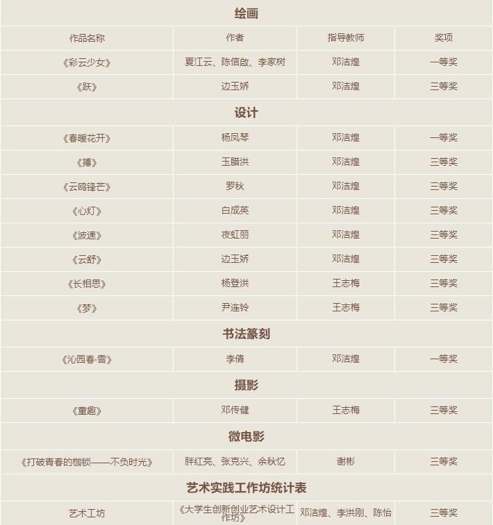 bevictor伟德国际1946官网已连续参加两届大艺展活动,本届为bevictor伟德国际1946官网获奖作品最多且奖项最高的一次。参赛中,同学们的精彩表现得到了评委们的高度好评。其中,合唱《宠爱》《崴萨啰》、群舞《学习》、朗诵《点赞中国》三个节目经过第一轮选拔进入现场展演,分别在云南省大剧院、云南艺术学院实验剧场,与其他兄弟院校共享盛宴,展演通过网络直播公开接受检验,最终获得二等奖的好成绩。其他递交作品,如绘画《彩云少女》、设计作品《春暖花开》、书法篆刻《沁园春·雪》荣获一等奖;小合唱《对面的女孩看过来》、绘画《跃》、摄影《童趣》、微电影《打破青春的枷锁——不负时光》、艺术工坊《大学生创新创业艺术设计工作坊》、设计作品《搏》《云鸥锋芒》《心灯》《波速》《云舒》《长相思》《梦》12件作品荣获三等奖。