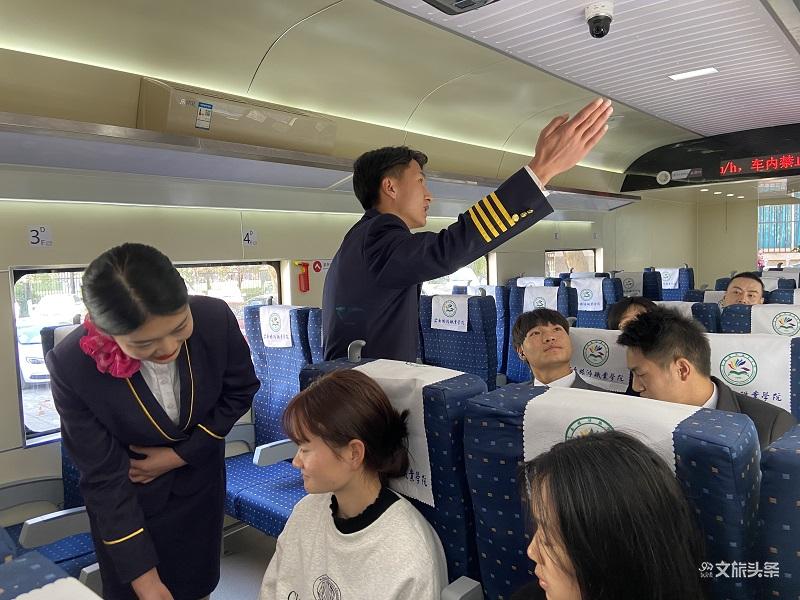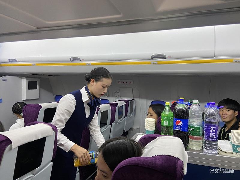 自助购票、安检、候车、刷脸乘车,在学校高铁站房实训室和高铁模拟舱内,身着高铁乘务制服的学生为参观者提供了乘坐高铁的全程体验服务,也展示了高速铁路客运乘务专业学生的专业能力。和高铁乘务一样,空中乘务对从业人员有着很高的服务要求,需要空中乘务员在高空飞行的过程中为旅客提供专业服务。在空中乘务实训室,空中乘务专业的学生为参观者提供了迎宾、引导就坐、安全检查、起飞后的餐食和饮品供应等飞行体验服务。