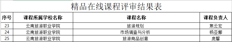 据悉,根据《云南省教育厅关于开展云南省职业教育提质培优行动计划(2020-2023年)在线精品课程认定工作的通知》要求,经院校自主申报、省教育厅形式审查、专家评审,共遴选出职业教育提质培优行动计划(2020-2023年)在线精品课程认定结果96个。其中,旅游类专业共有5门课程入选。