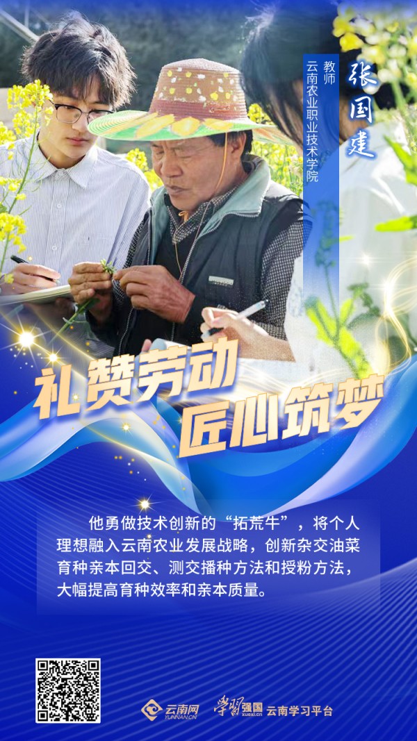 张国建勇做技术创新的“拓荒牛”,亲自规划、组织施工,开垦荒地50亩扩建育种基地,完善设施设备,创新杂交油菜育种亲本回交、测交播种方法和授粉方法,大幅提高育种效率和亲本质量。在他的带领下,团队选育出27个“花油”系列、云油“杂”系列油菜品种,占据云南每年450万亩推广种植面积的80%,为云南油菜产业发展提供了坚实的品种支撑,助力云南“绿色食品牌”建设。他培养出众多优秀农业人才,其学生遍布基层油菜事业岗位,为云南农业发展注入源源不断的人才动力。
